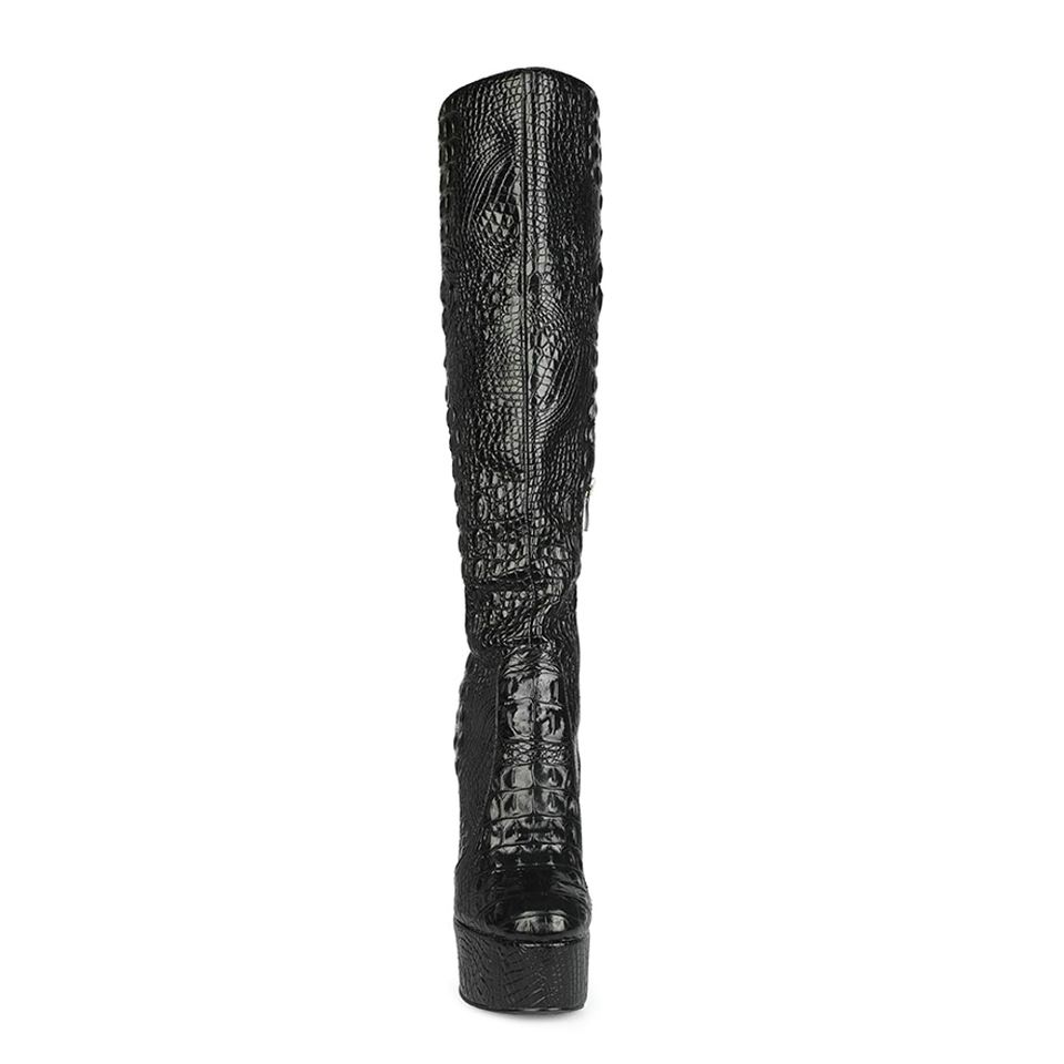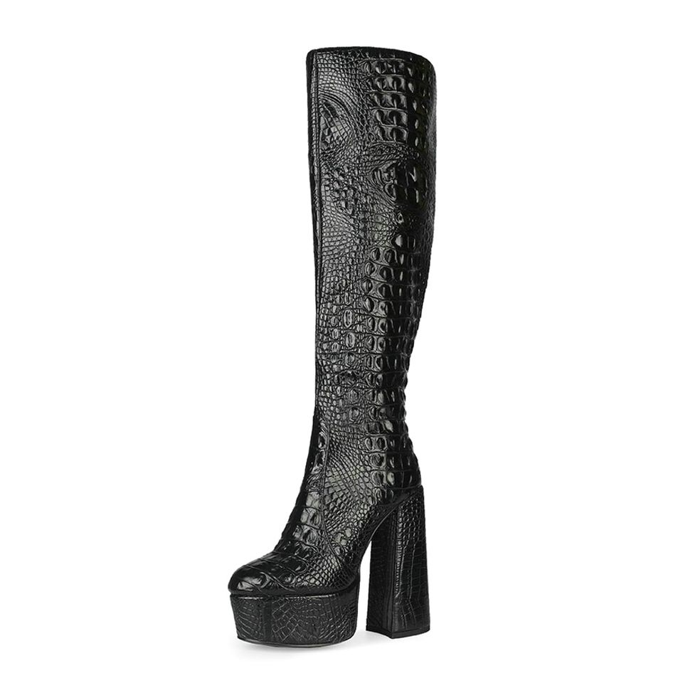 รองเท้าบูทผู้หญิงแบบสวม ส้นหนา ลายหนังจระเข้ กันน้ำ สไตล์ตะวันตก ทำมือ สีดำ สำหรับฤดูใบไม้ร่วงและฤดูหนาว