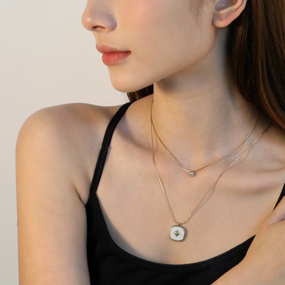 สร้อยคอแฟชั่นขายส่ง ชุบทอง 18K จี้รูปหัวใจซ้อนกัน ประดับเพชรทรงสี่เหลี่ยมและดาว สร้อยคอสแตนเลส 316L