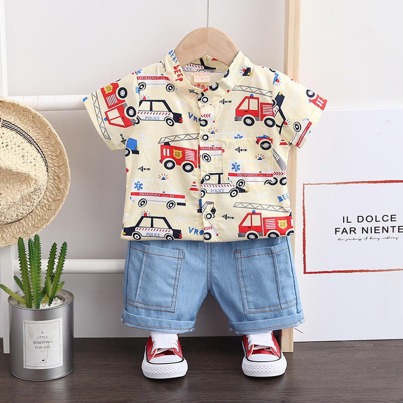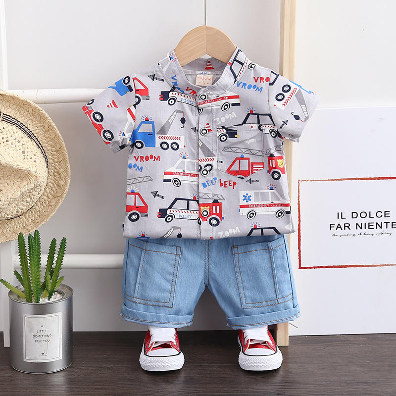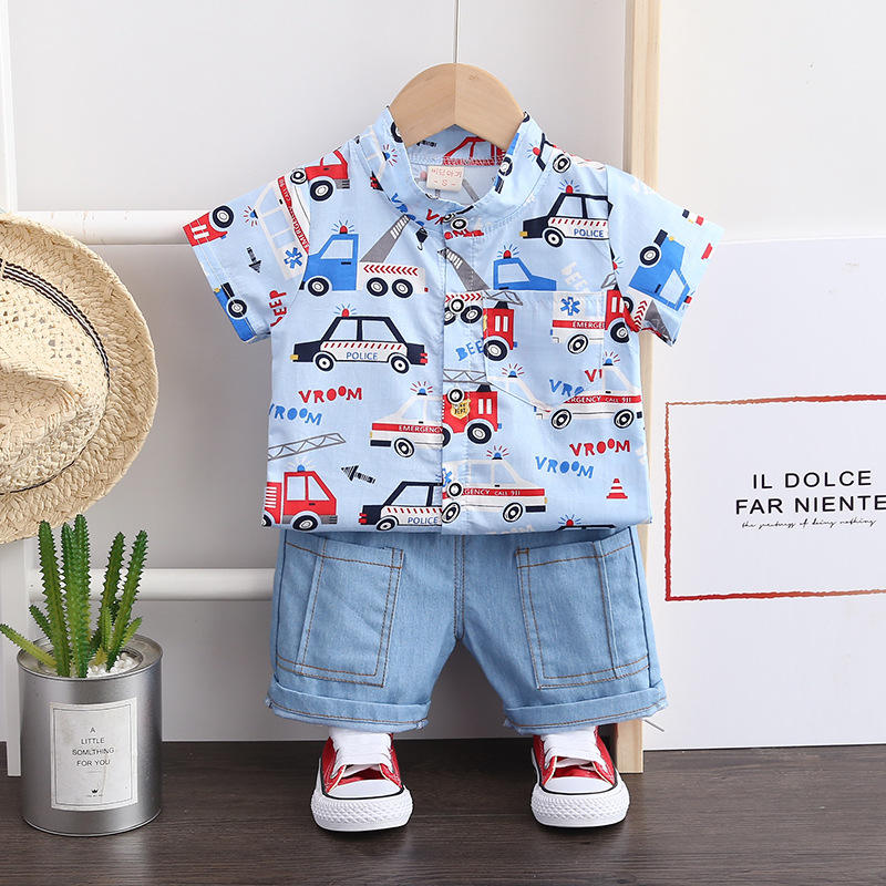 ชุดเสื้อผ้าเด็กผู้ชาย ลายรถ เสื้อเชิ้ต และกางเกงยีนส์เด็ก