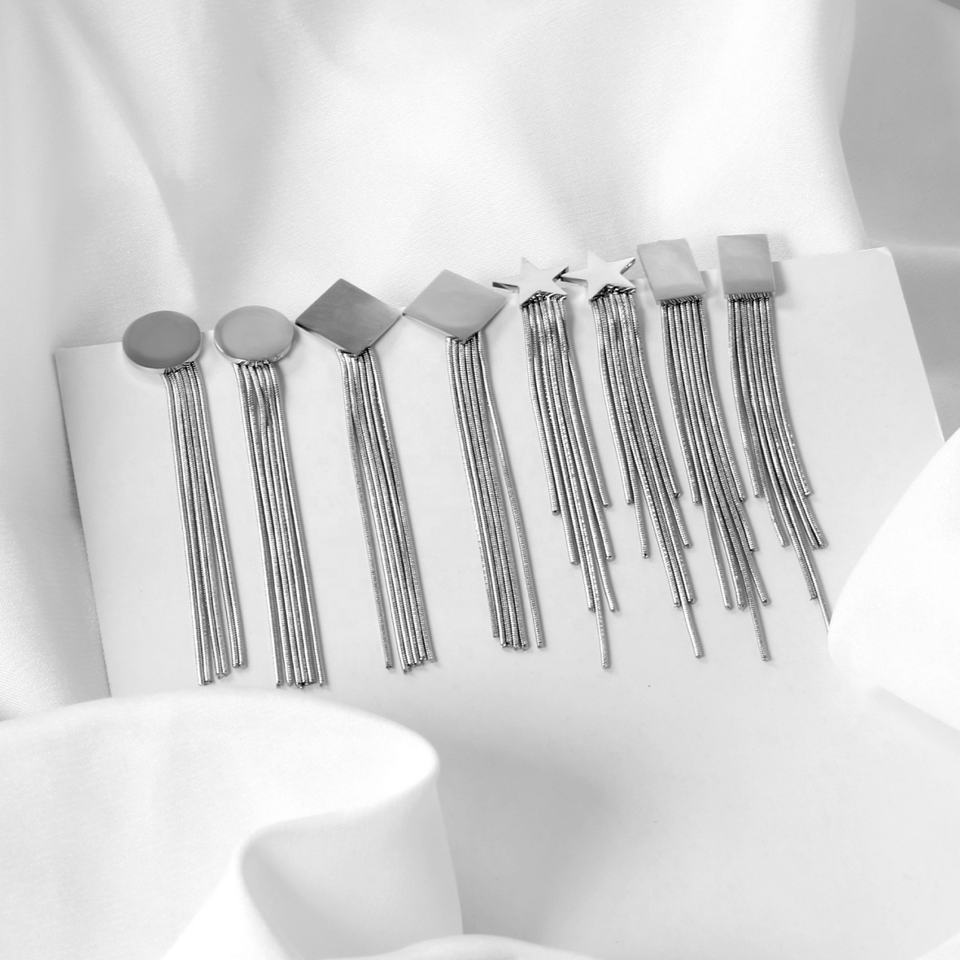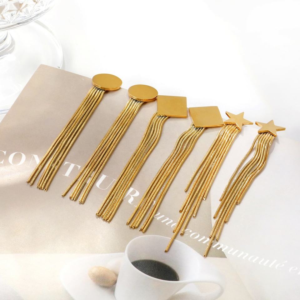 ต่างหูแฟชั่นขายส่ง สแตนเลสชุบทอง 18K ดีไซน์เรโทรทรงเรขาคณิต พู่ห้อยยาว สำหรับผู้หญิง