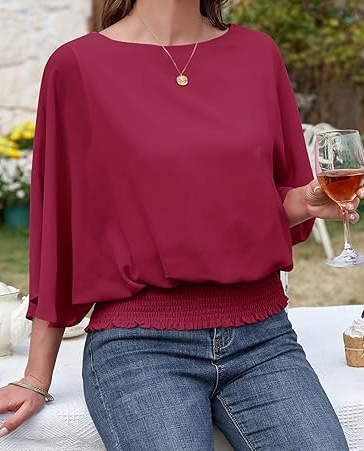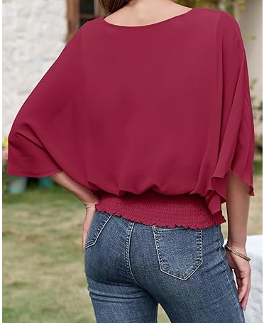 เสื้อชีฟองแฟชั่นสำหรับผู้หญิงมีแขนค้างคาวสามส่วนและเสื้อลำลองทรงหลวมคอกลมสำหรับสวมใส่สบายทุกวัน