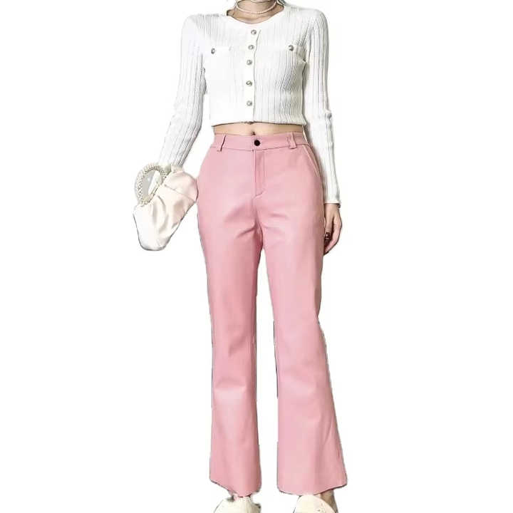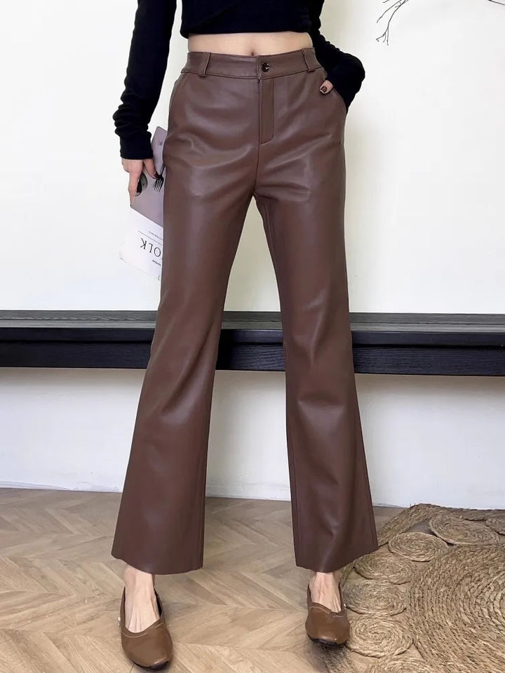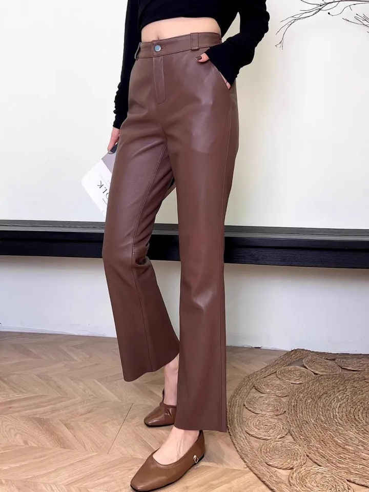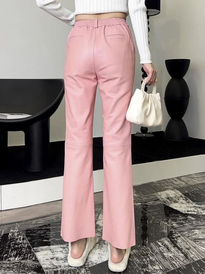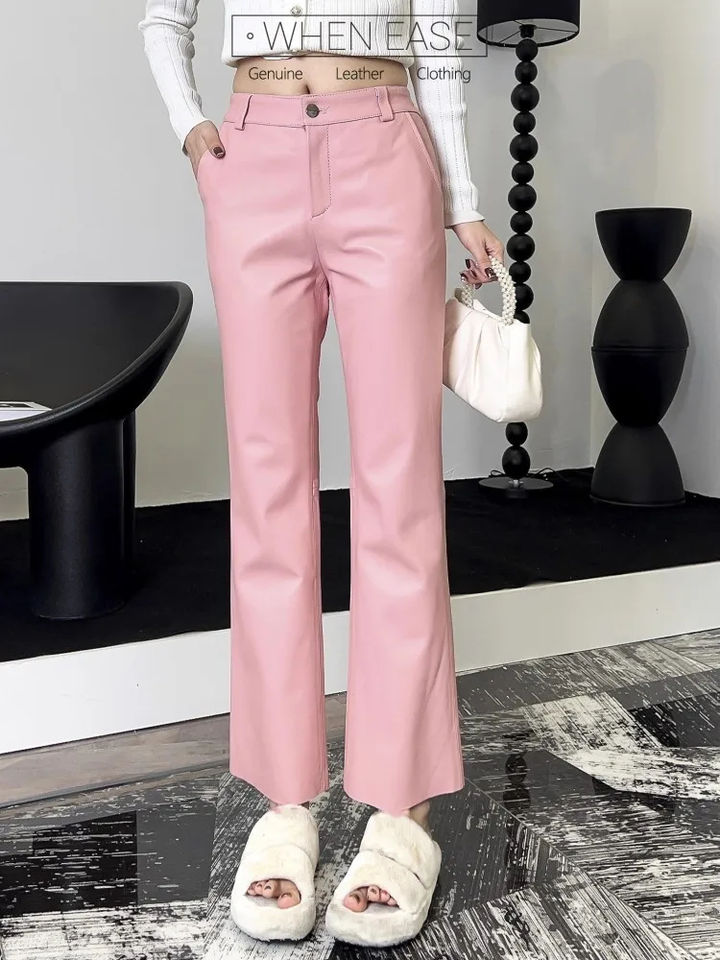 กางเกงแฟชั่นหนังแท้สำหรับผู้หญิงกางเกงเอวยืดแบบบางกางเกงยาวถึงข้อเท้ากางเกงหนังแกะกางเกงขาบานหรูหรา M-4XL