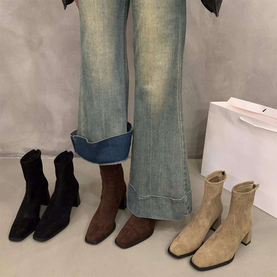 รองเท้าบูทแฟชั่นผู้หญิง ส้นสูงหนา หัวเหลี่ยม ซิปหลัง ทรงเข้ารูป เหมาะสำหรับฤดูใบไม้ร่วง ฤดูหนาว สวมใส่สบายๆ หรือใส่ทำงานได้