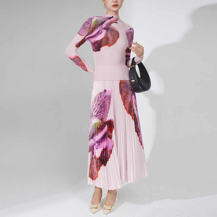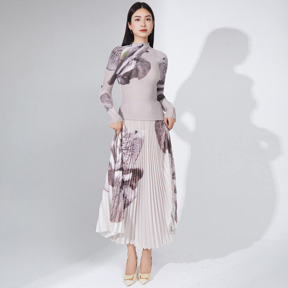 ชุดสูทกระโปรงพลีทแฟชั่นสำหรับผู้หญิงเสื้อยืดแขนยาวจับจีบ + กระโปรงชุดสองชิ้นลำลองสไตล์ใหม่สินค้าขายดี