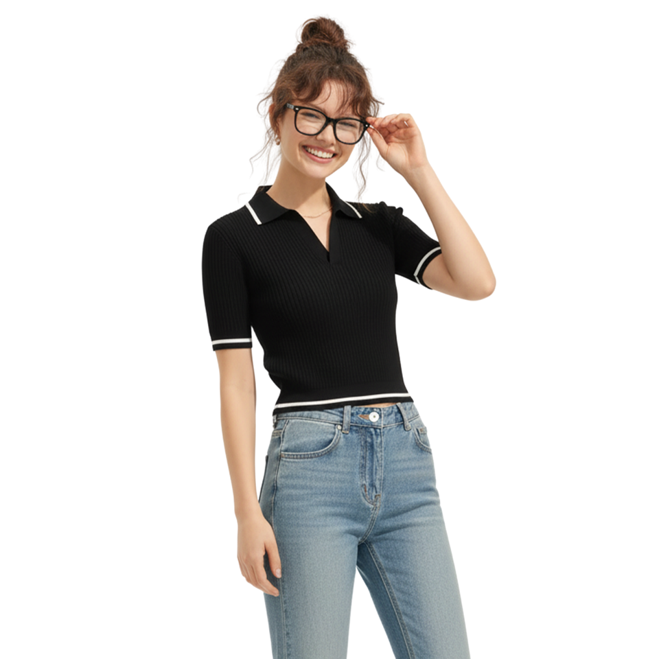 เสื้อโปโลผู้หญิงแฟชั่น แขนสั้น ผ้าถักลายริบ แต่งปกและแขนเสื้อสีตัดกัน ผ้าคุณภาพสูง ผลิตในเวียดนาม