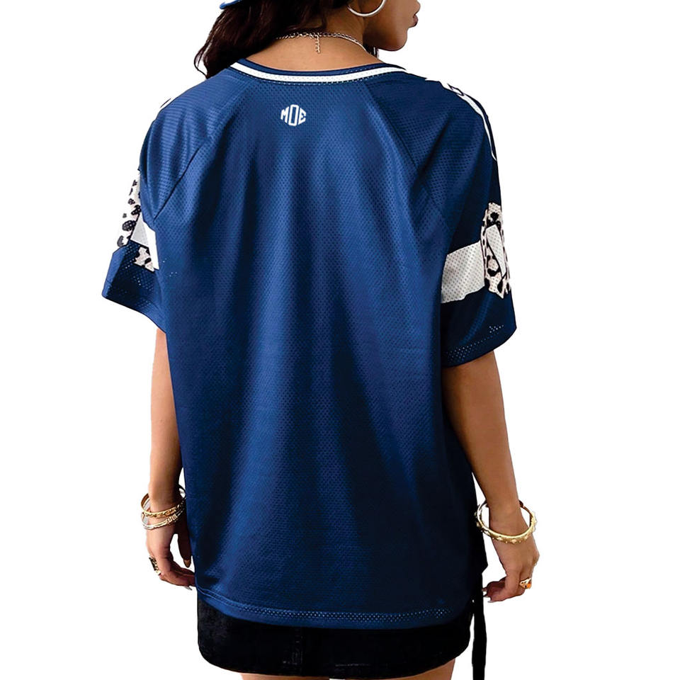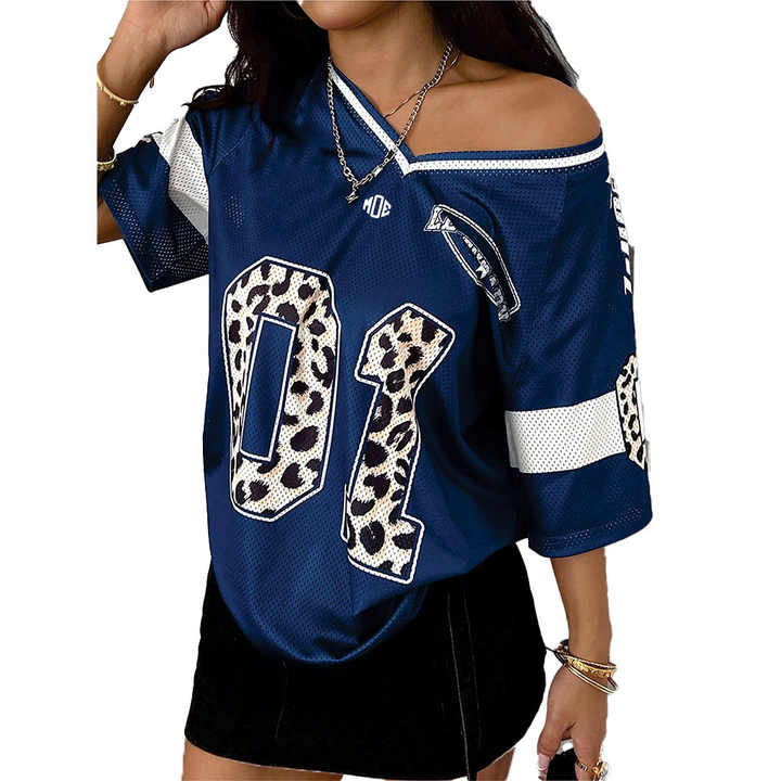 แฟชั่นผู้หญิงฤดูใบไม้ผลิฤดูร้อนฤดูใบไม้ร่วงสไตล์สตรีท, Y2K เสื้อฟุตบอลลายเสือดาวพิมพ์ลายดิจิตอลเสื้อยืดคอกลมแบบเว้า V
