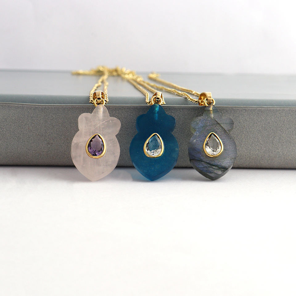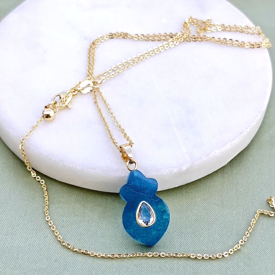 สร้อยคอแฟชั่นชุบทอง 18k ประดับหยกอะพาไทต์สีน้ำเงิน ลายดอกไม้แกะสลัก พร้อมจี้ทรงหยดน้ำประดับเพชร CZ สีขาว