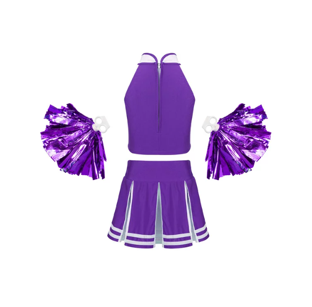 ชุดเชียร์ลีดเดอร์สีม่วงและสีทอง พิมพ์ลายตามสั่งสำหรับผู้ใหญ่ ผลิตจากโพลีเอสเตอร์ 100%