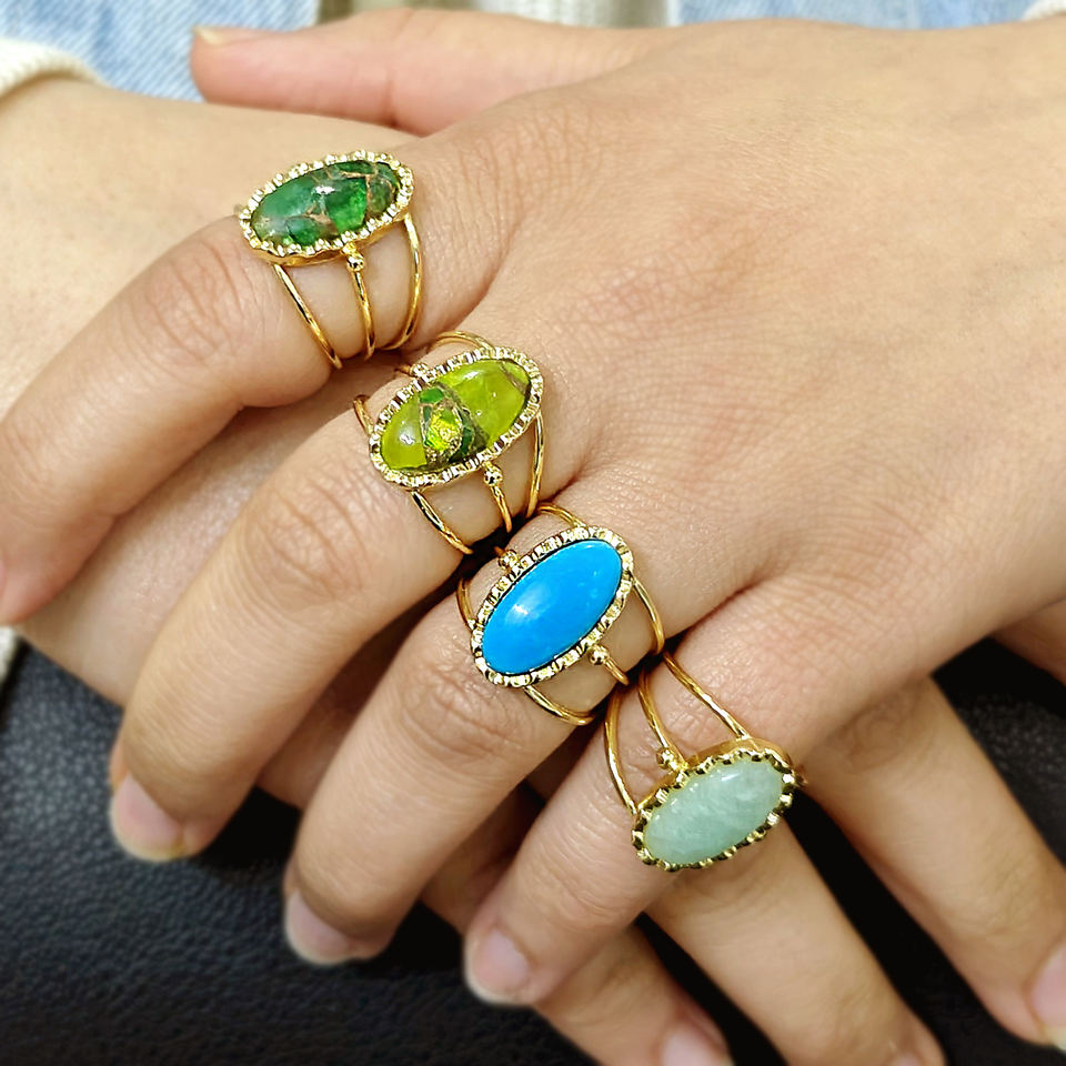 แหวนแฟชั่นประดับพลอยคาโบชองสีฟ้าเทอร์ควอยซ์สามชั้น ชุบทอง 18k รูปวงรี ปรับขนาดได้ สำหรับผู้หญิง