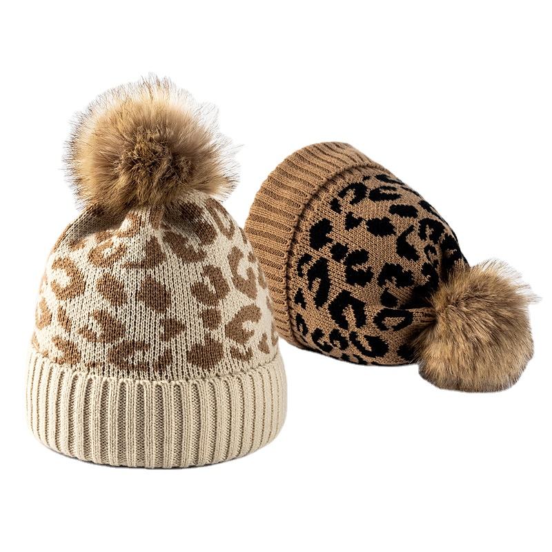 หมวกปอมปอมสำหรับผู้หญิงผ้าแจ็คการ์ดลายเสือดาวถักแฟชั่นทันสมัยสำหรับฤดูหนาว2026