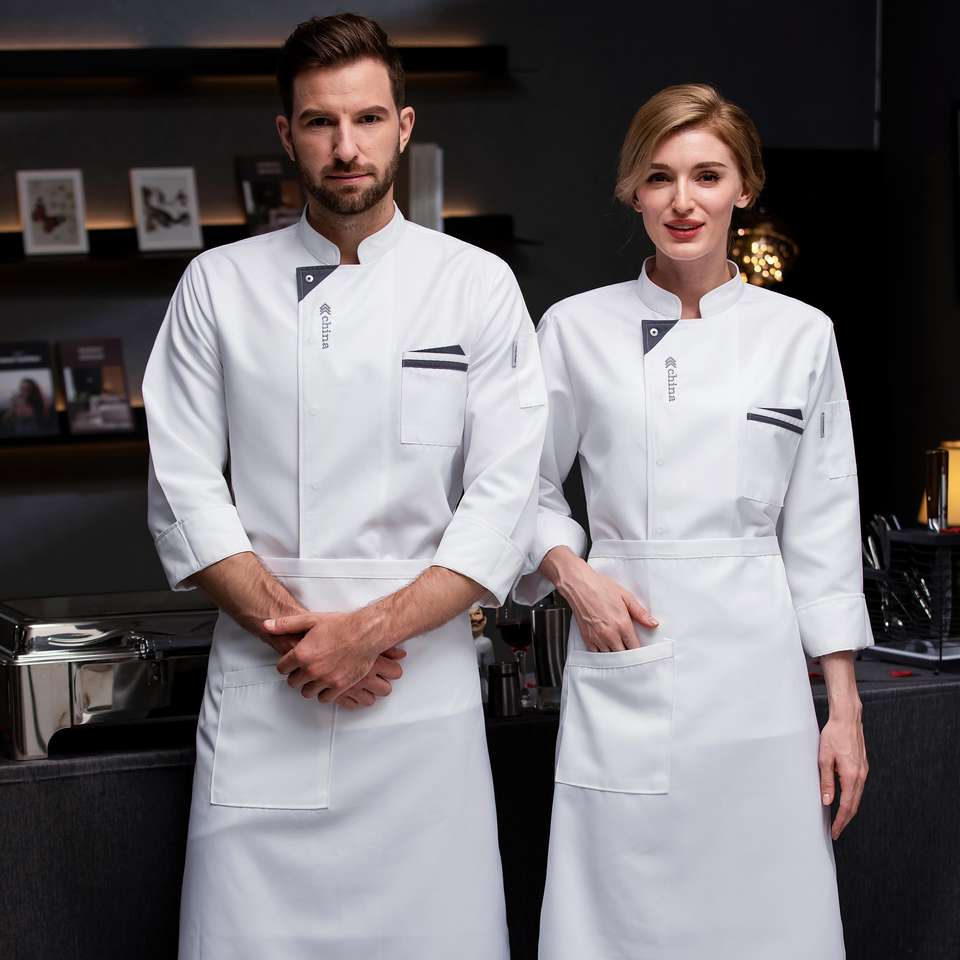 ภาพแฟชั่นคอสามเหลี่ยมสีขาว uniforme Para mesero de restaurante Chef Uniform Design uniforme