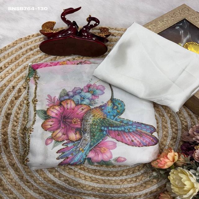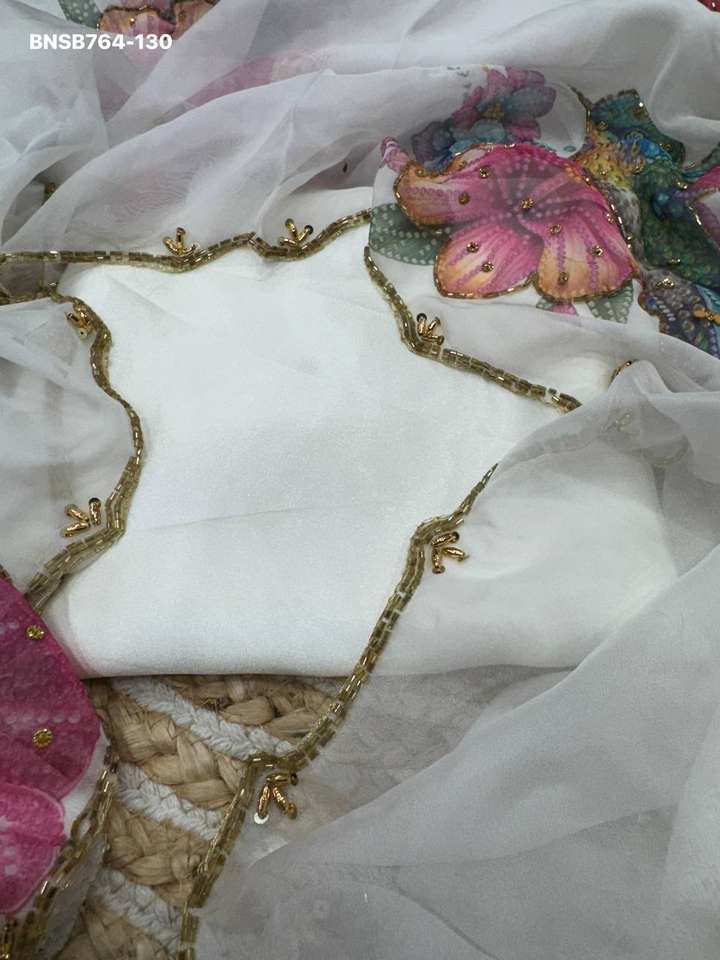 ผ้าไหมเทบบี้พิมพ์ลายดอกไม้สุดหรูหรา สีสันสวยงามทันสมัย พร้อมงานปักด้วยมือด้วยไหมพรมและมุก ผลิตโดยผู้ผลิตผ้าส่าหรีจากเมืองสุรัต