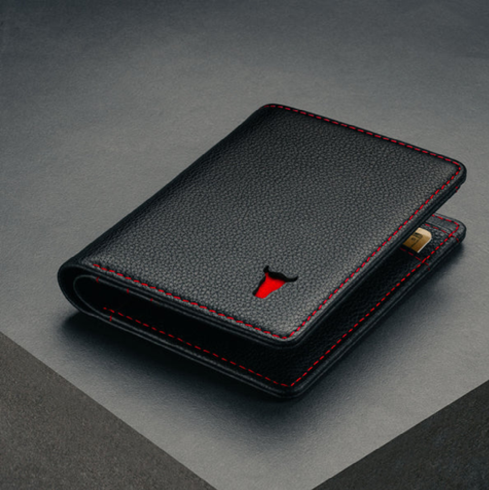 กระเป๋าสตางค์ Bifold สีดำที่ทันสมัยพร้อมการเย็บสีแดงและการออกแบบโลโก้วัวที่ไม่ซ้ำใครใช้ได้ในราคาขายส่ง