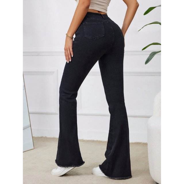 กางเกงยีนส์แฟชั่นทรงบูทคัทสีดำสำหรับผู้หญิง สไตล์ลำลอง หรูหรา ทันสมัย เอวสูง ทรงขาบาน ผ้าเดนิมยืดได้ สไตล์สตรีท