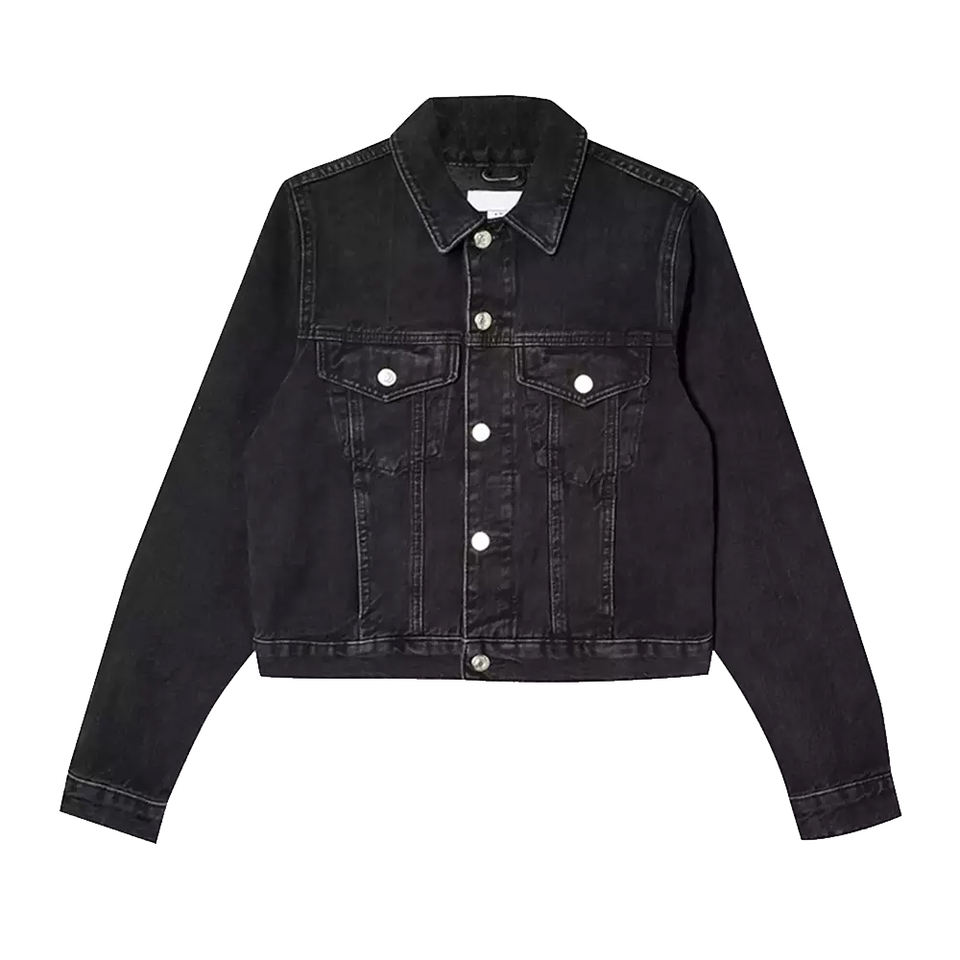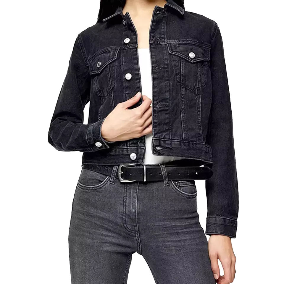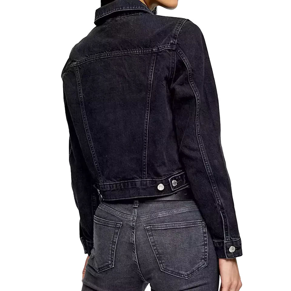 แจ็กเก็ตยีนส์แฟชั่นทรงครอปสำหรับผู้หญิงแจ็กเก็ตยีนส์ผ้าฝ้ายสีดำย้อนยุคมีกระดุมปิดเสื้อแจ็กเก็ตเดนิมที่กำหนดเองได้