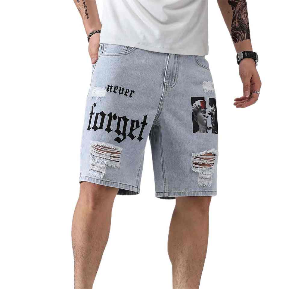 กางเกงยีนส์ขาสั้นผู้ชายแฟชั่น สกรีนโลโก้ได้ตามต้องการ สีน้ำเงิน เสื้อผ้าฤดูร้อน กางเกงยีนส์เดนิมชาย ผลิตในปากีสถาน