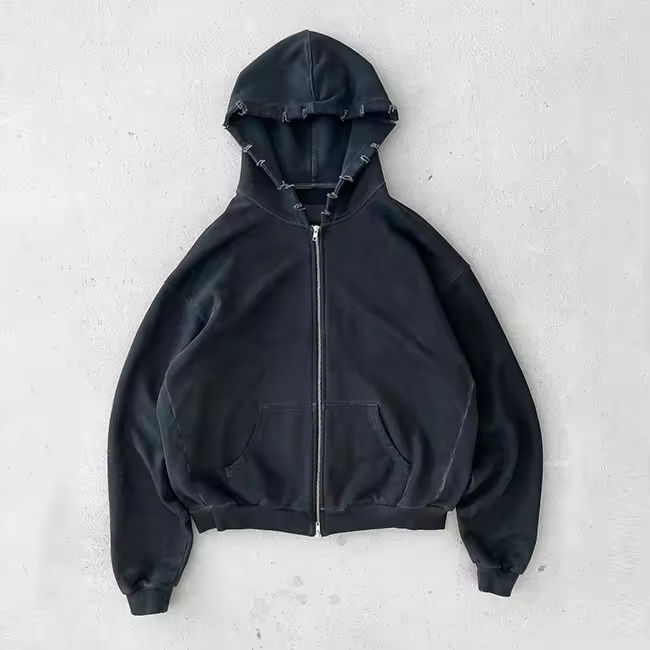 เสื้อฮู้ดแนวสตรีทของผู้ชายเสื้อฮู้ดแบบมีซิปสไตล์ที่ทันสมัยมีเอกลักษณ์ขนาดโลโก้ที่กำหนดเอง450gsm ขายดี