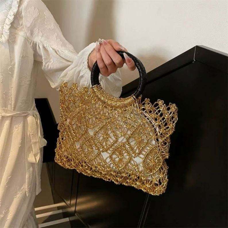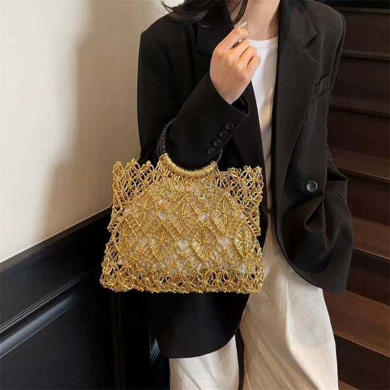 กระเป๋าสานทรงสี่เหลี่ยมสีทองเงินสุดเก๋ กระเป๋าโท้ทแบบโปร่งใหม่สำหรับวันหยุดริมทะเล กระเป๋าชายหาดลำลอง