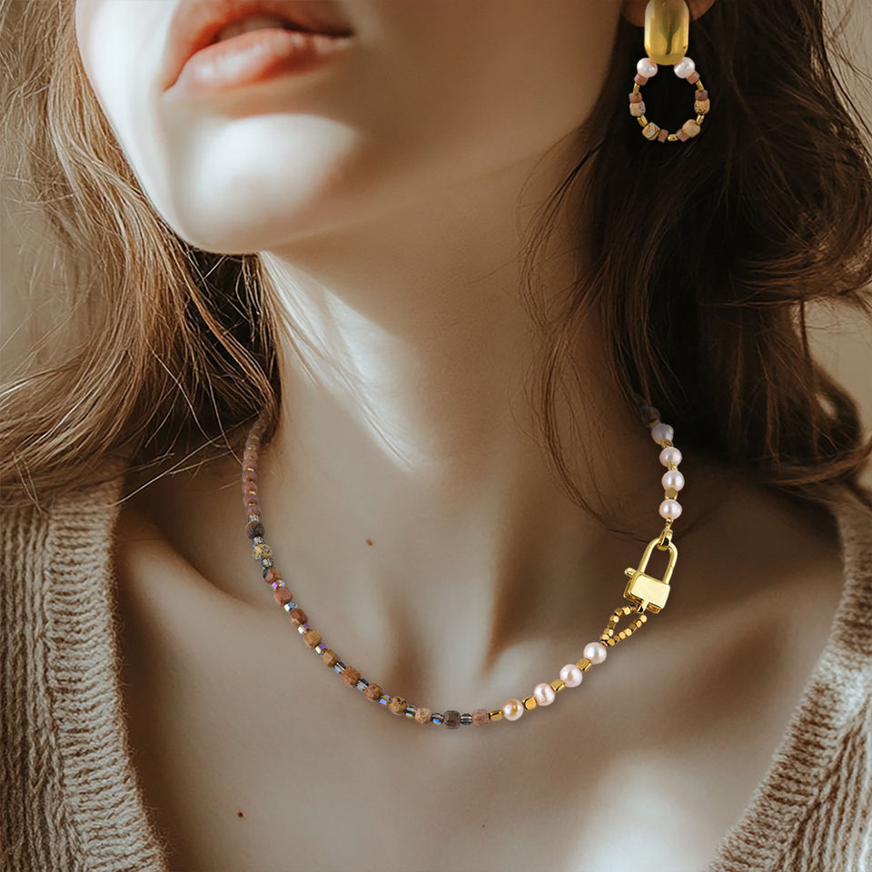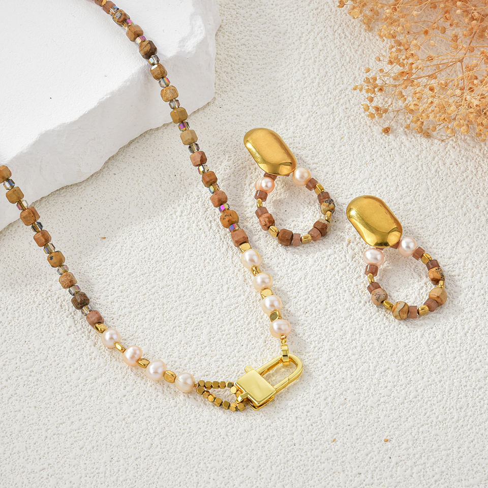 ชุดเครื่องประดับสีทองที่ทันสมัยพร้อมไข่มุกและหินธรรมชาติสำหรับโอกาสกึ่งทางการใดๆ