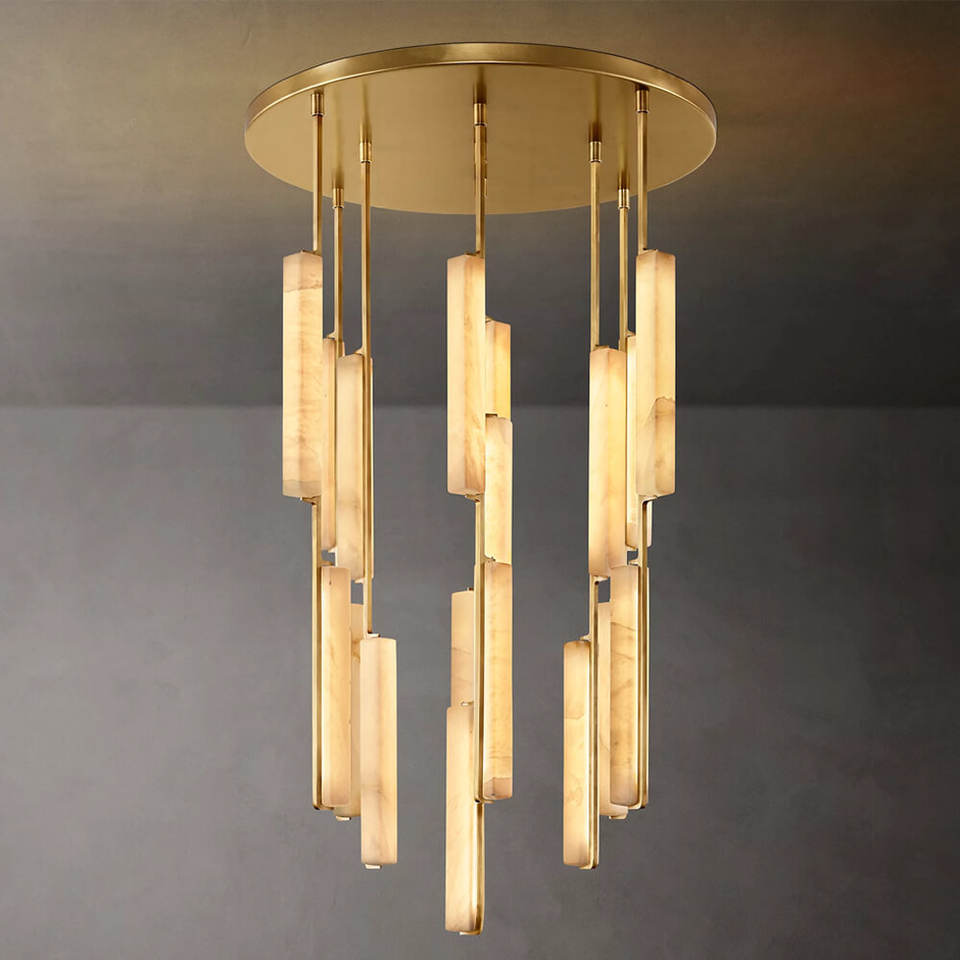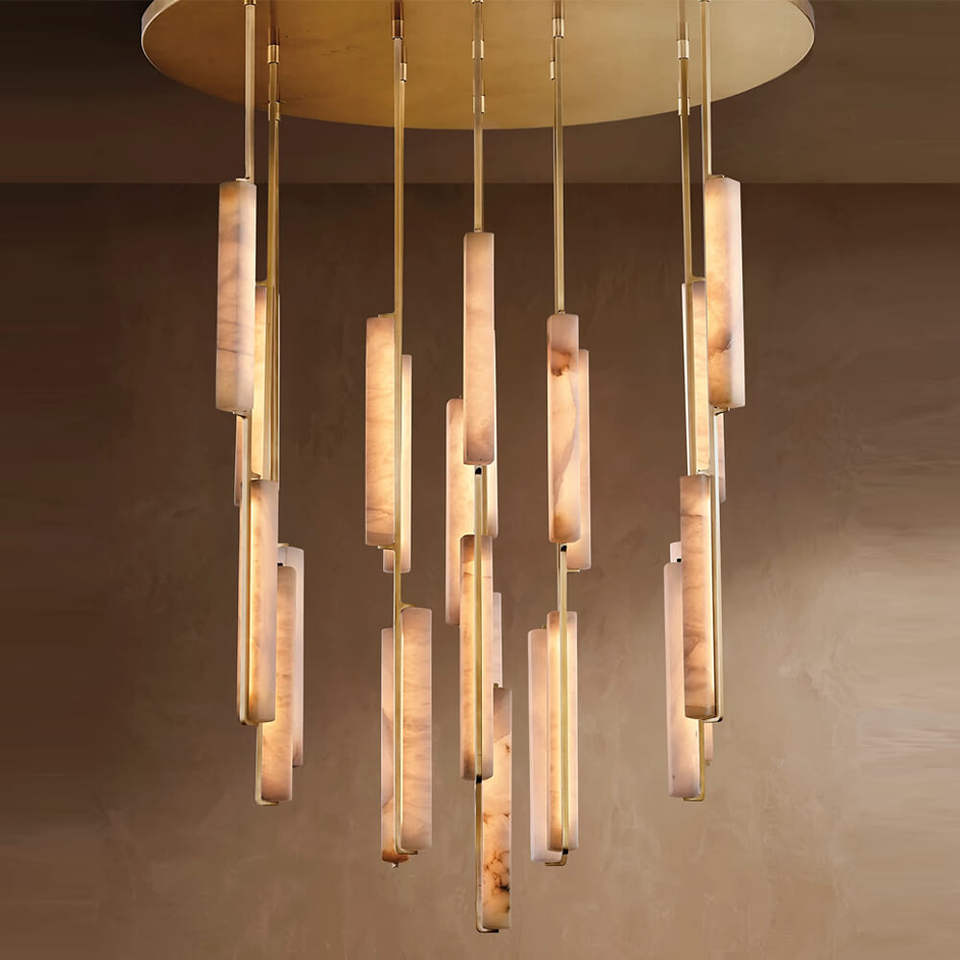 โคมไฟระย้าอะลาบาสเตอร์คุณภาพสูงทันสมัยสำหรับห้องนั่งเล่นเพดานสูง โคมไฟระย้าบันได โคมไฟระย้าทองเหลืองหรูหราทันสมัย