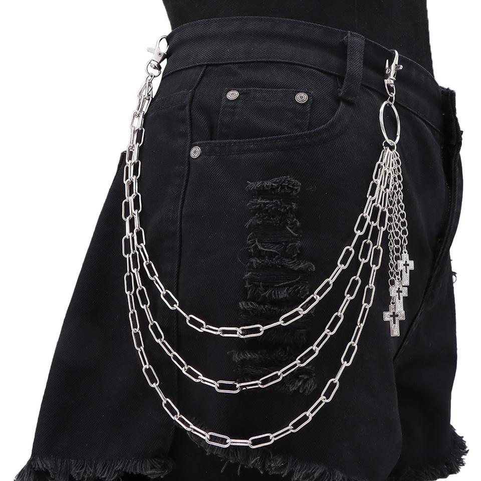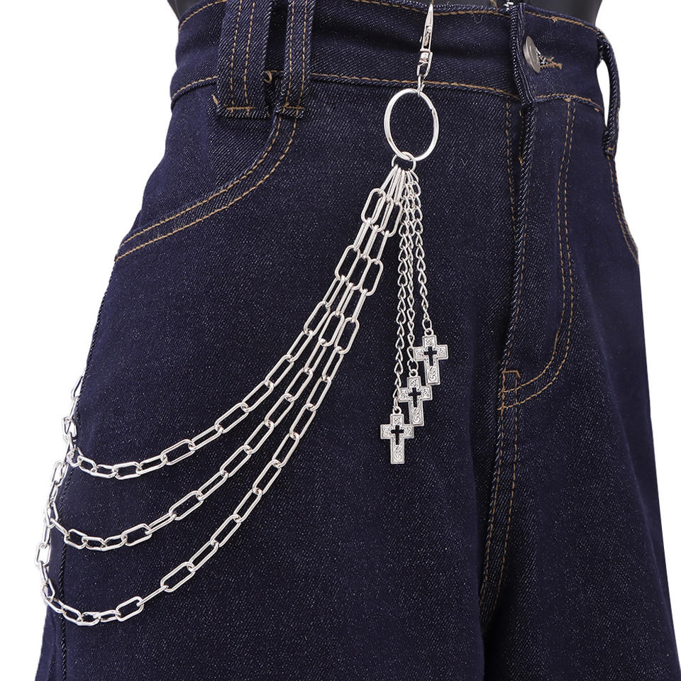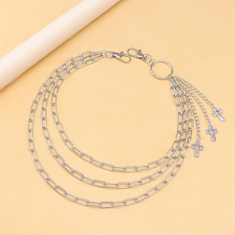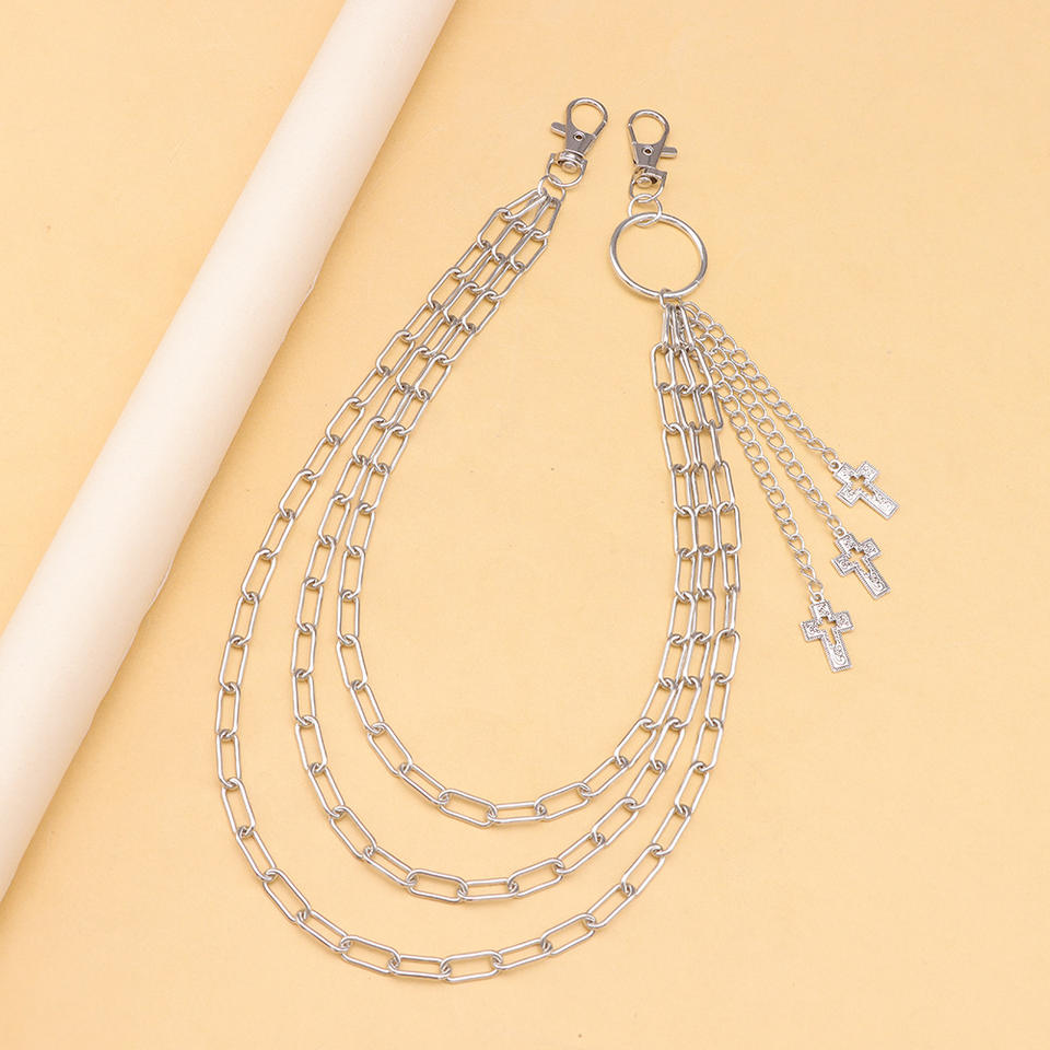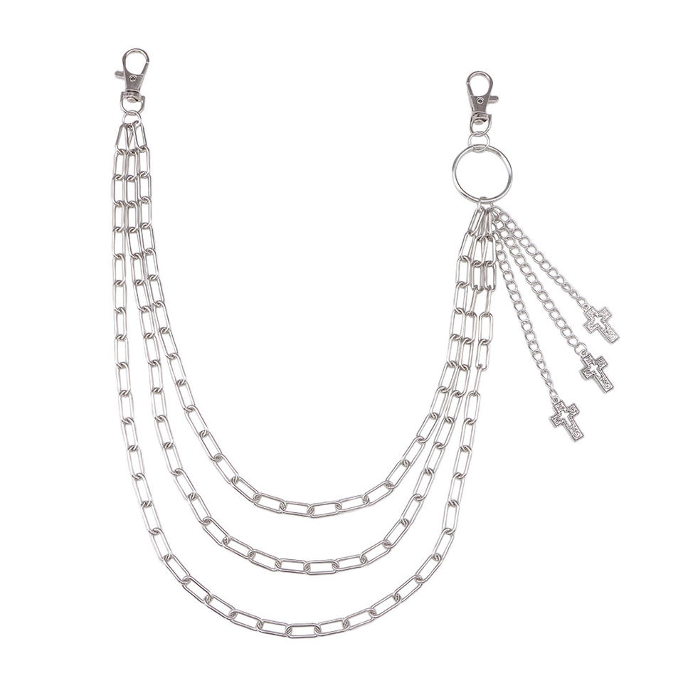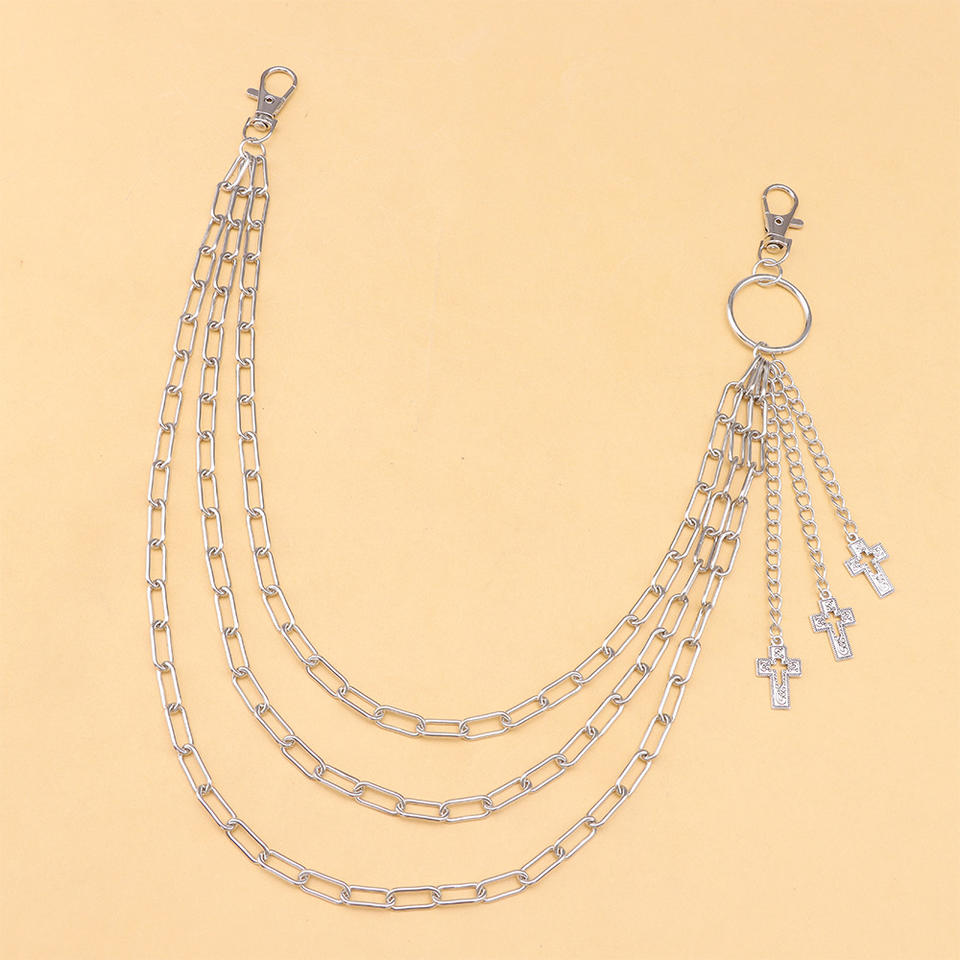 โซ่คล้องกางเกงแฟชั่นแบบหลายชั้น ดีไซน์รูปทรงกากบาท วัสดุโลหะสำหรับตกแต่งกางเกงยีนส์ สไตล์ฮิปฮอป สีเงินทิเบต ขาว K สามชั้น