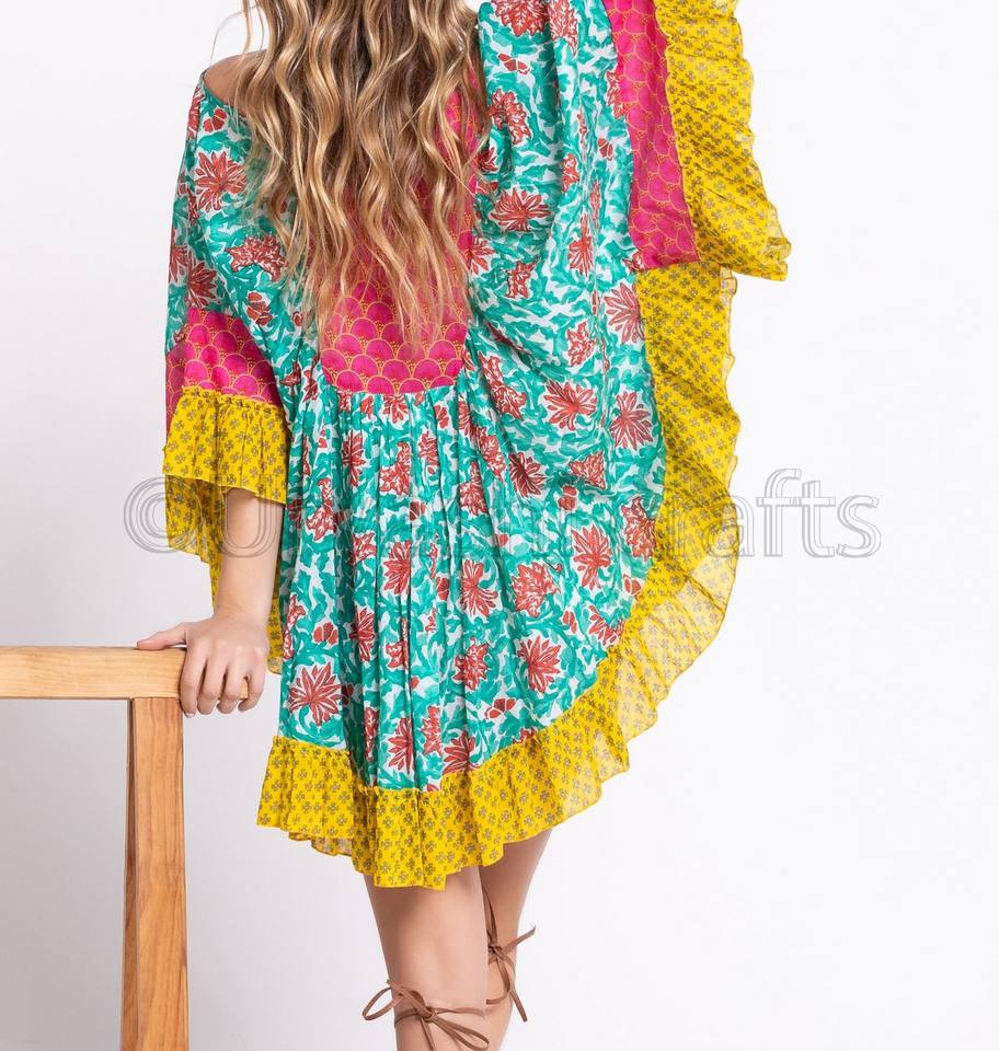 แฟชั่นร้อนดูผู้หญิงเครื่องแต่งกายผ้าไหมพิมพ์ Kaftan เย็นไหล่คอปักเข่าความยาวพิมพ์ Kaftan
