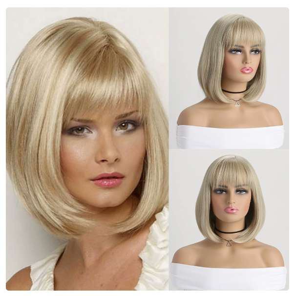 ทรงผมบ๊อบเทียมของสุภาพสตรีทันสมัยพร้อมวิกผมหน้าม้าตรงสีทองอ่อน