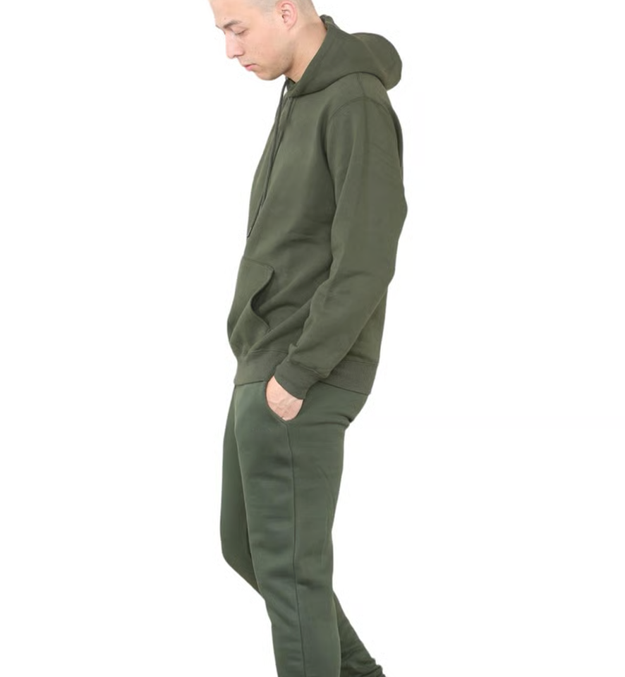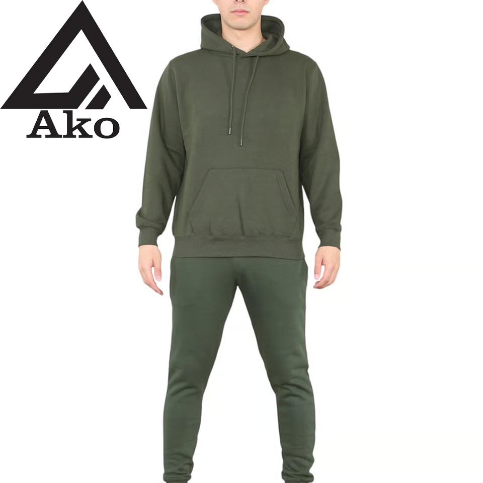 ชุดเซ็ตเสื้อฮู้ดดี้โอเวอร์ไซส์สีเขียวมะกอกพิมพ์โลโก้ตามสั่งและกางเกงจ็อกเกอร์ผ้าฟลีซหนานุ่มสำหรับผู้ชาย แบรนด์ Ako