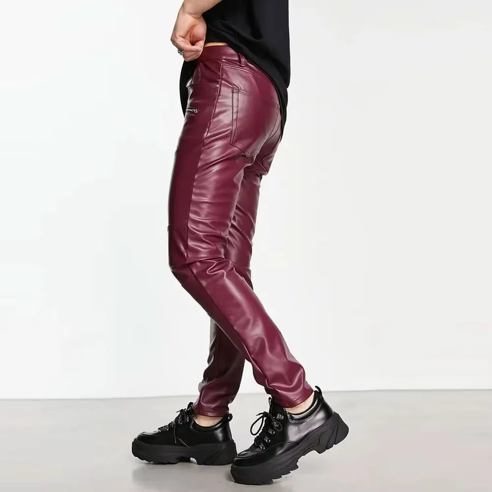 กางเกงหนังแฟชั่นเข้ารูปสำหรับผู้ชายกางเกงหนังเอวกลางน้ำหนักเบาปรับแต่งได้กางเกงหนังลายทางทรงโค้งตรง