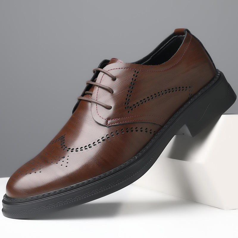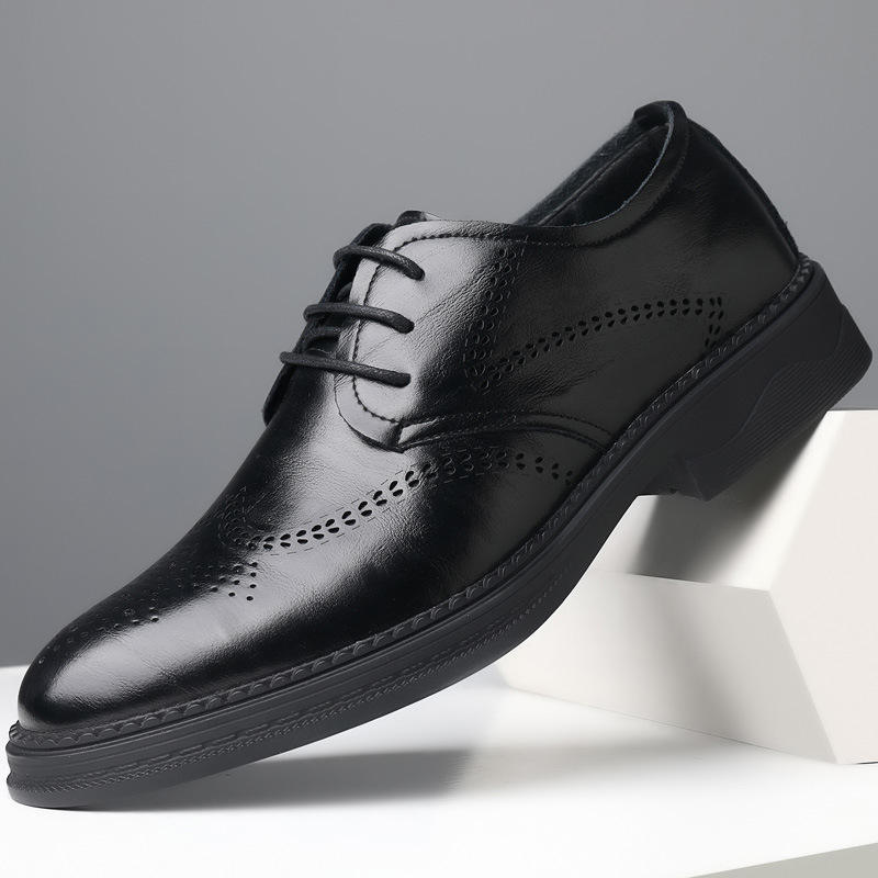 รองเท้าผู้ชายแฟชั่นสไตล์ลำลองทางธุรกิจ แบบมีลายสลัก ทรงหัวแหลม ผูกเชือก เพิ่มความสูง วัสดุไมโครไฟเบอร์ ระบายอากาศได้ดี