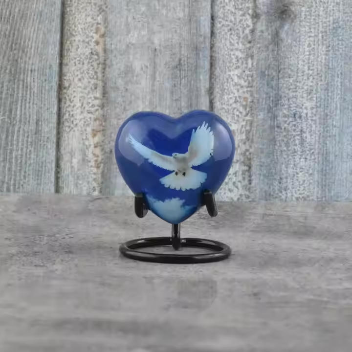 โกศโลหะสำหรับเผาศพที่ทันสมัยพร้อมนกบินได้และไม้กางเขนของพระเยซูรูปทรงโลหะที่เป็นเอกลักษณ์พร้อมขาตั้งรูปหัวใจในราคาที่ดีที่สุด