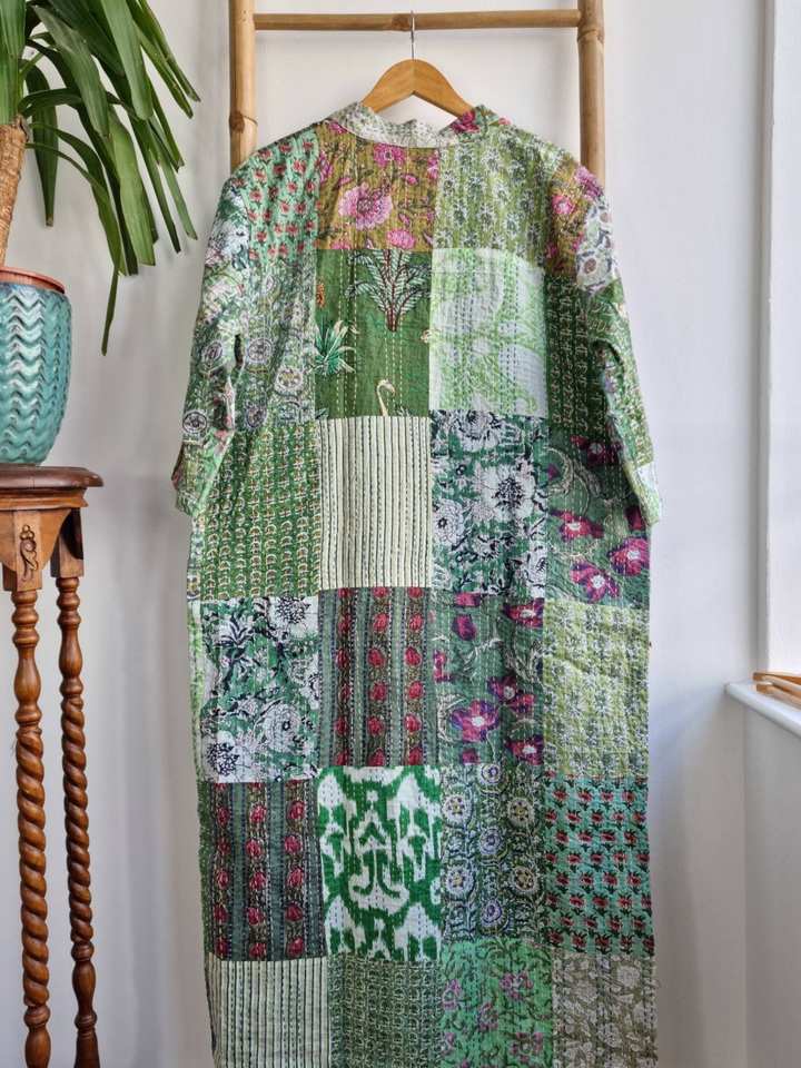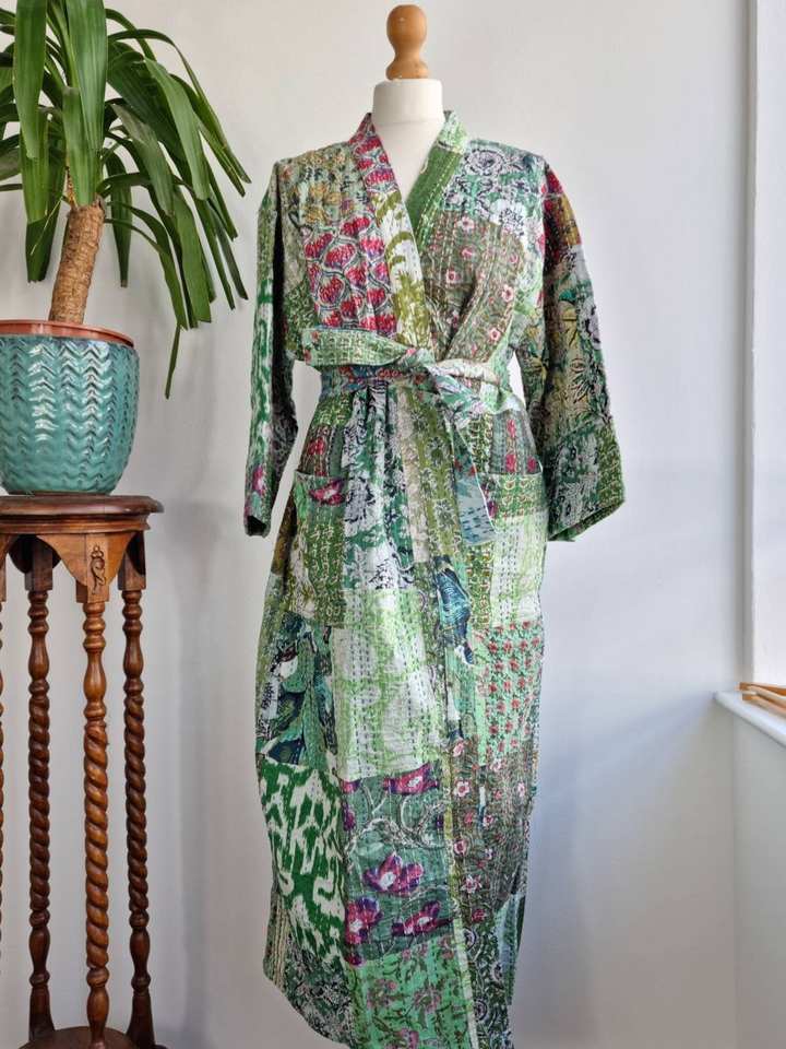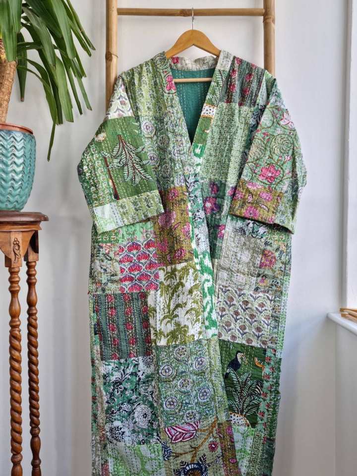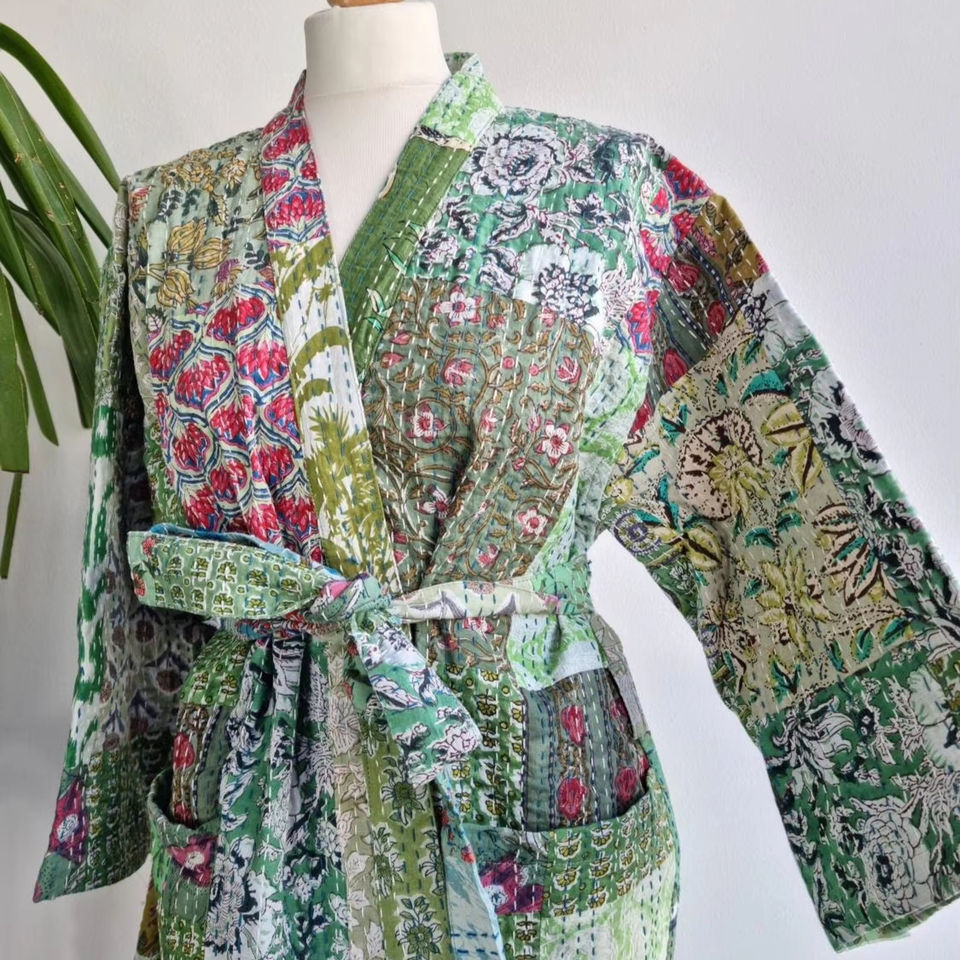 ชุดกิโมโน Kantha ธรรมชาติที่ทันสมัยสำหรับผู้หญิง, ชุดเดรสลำลองผ้าฝ้าย100% ระบายอากาศยาวถึงเข่าแบบซักได้ดิจิตอล