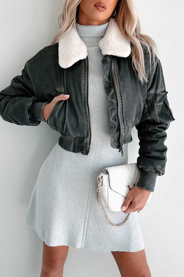 Fashionable New Dark Grey Plush Patchwork Faux Leather Zip Long Sleeve Short Pilot Jacket Women's Biker Jackets Custom Wholesale
