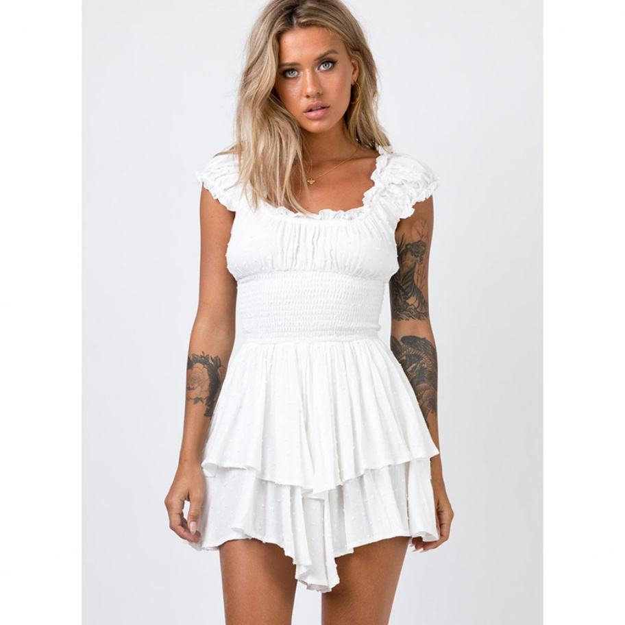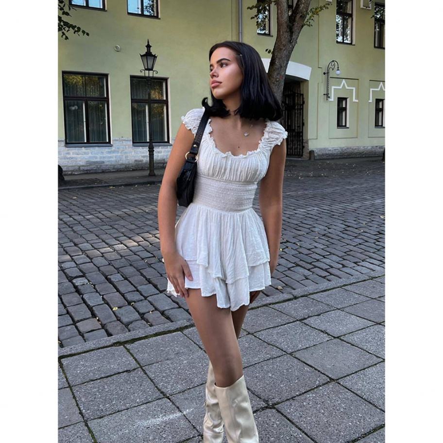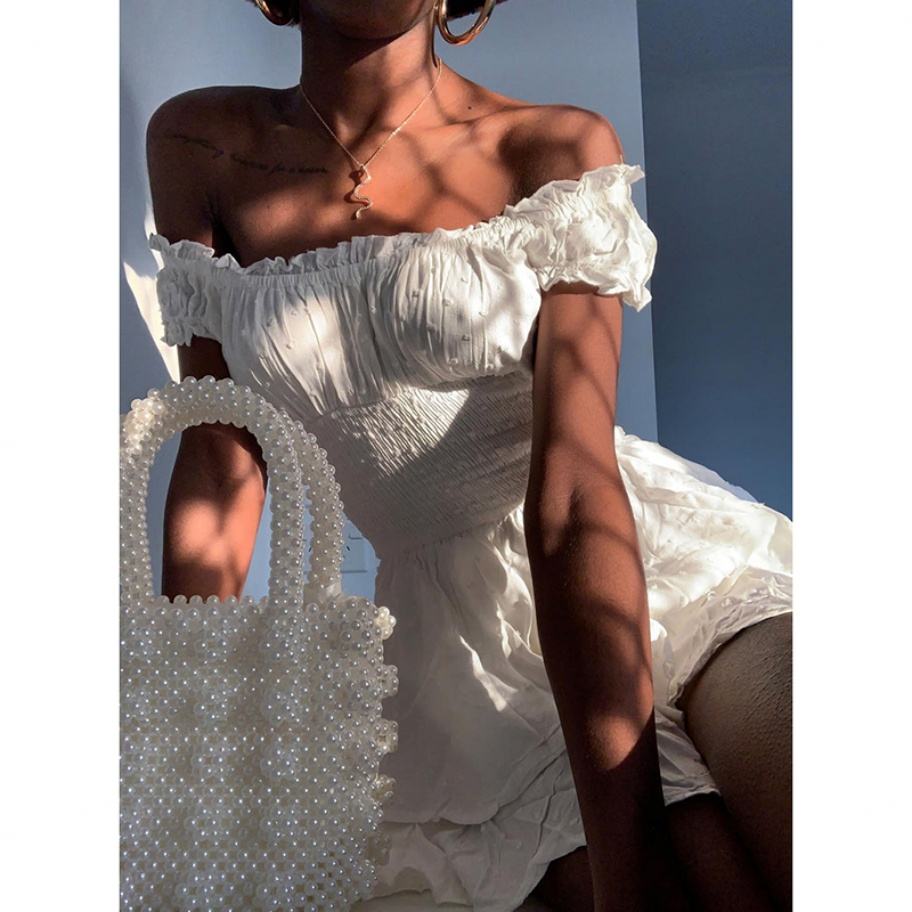 เดรสสั้นแฟชั่นเปิดไหล่สำหรับสาวๆ สไตล์สตรีท แต่งระบายรัดเอว ผ้ารัชเชอร์ รักษ์โลก แขนสั้น ทรงพอดีตัว