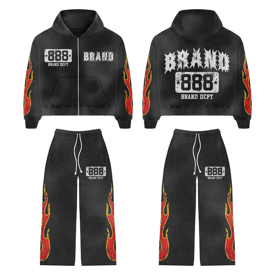 ชุดกีฬาแฟชั่นไซส์พลัส พิมพ์ลายสกรีน เสื้อฮู้ดซิปและกางเกงขาบาน ชุดวอร์ม เสื้อฮู้ดซิปพร้อมกางเกงขาบาน