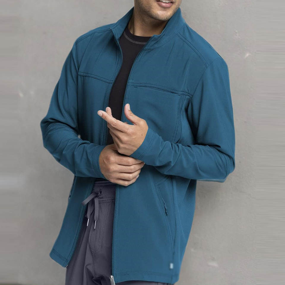 เสื้อแจ็คเก็ตแพทย์สปาทันสมัยสำหรับผู้ชาย ชุดสครับยืดได้ ชุดสครับทางการแพทย์ ชุดพยาบาล ชุดยูนิฟอร์มโรงพยาบาล ชุดสครับพร้อมปักโลโก้ตามสั่ง