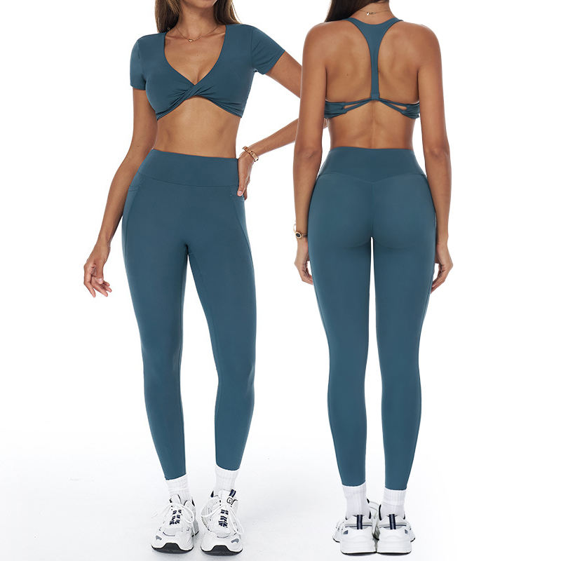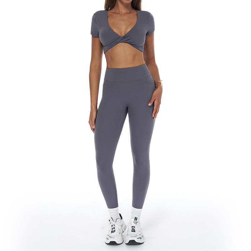 ชุดโยคะบราเซ็กซี่ทันสมัย ระบายอากาศได้ดี แห้งเร็ว กางเกงเอวสูง แขนสั้น ลายเรียบ สำหรับวิ่งออกกำลังกายกลางแจ้ง