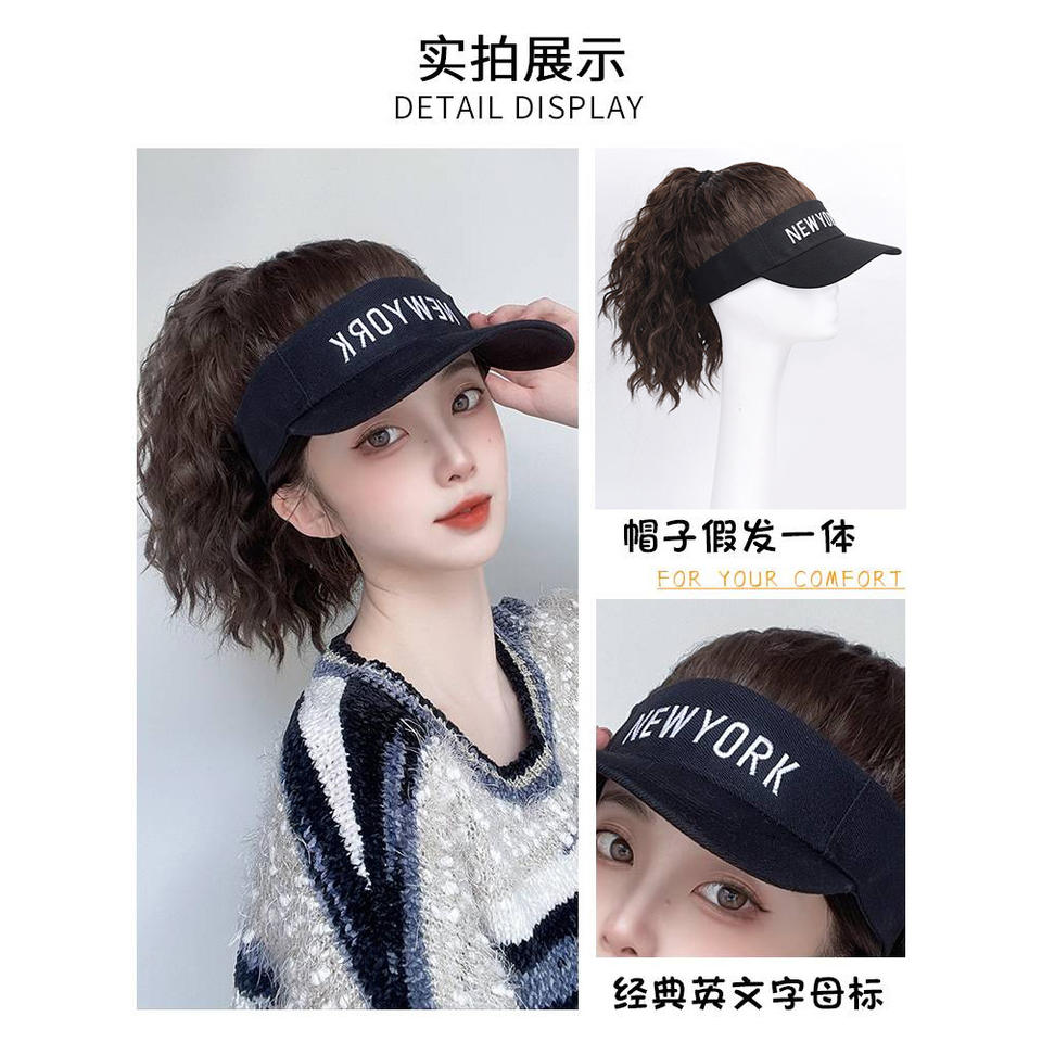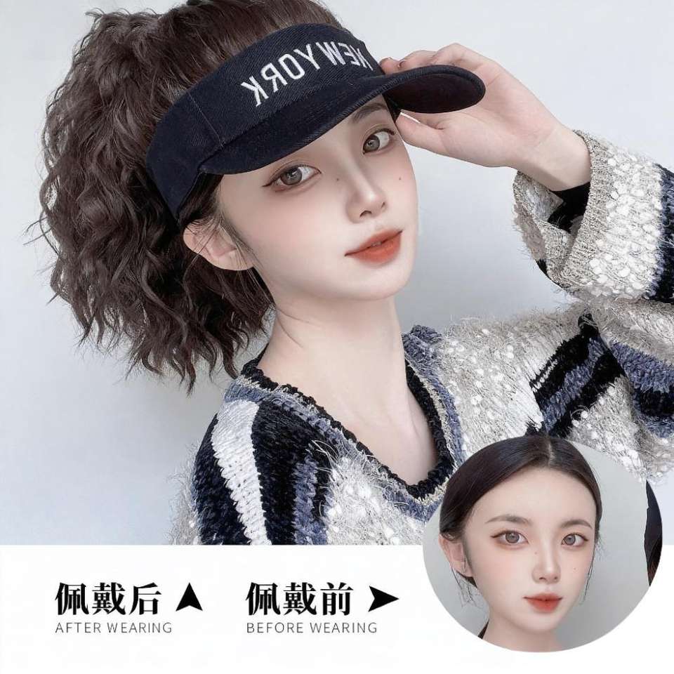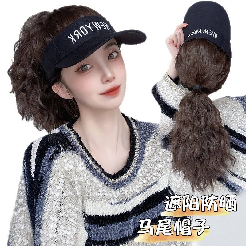 หมวกกันแดดแฟชั่นสำหรับฤดูร้อนพร้อมวิกผมยาวหยิกแบบติดในตัว ปอยผมด้านข้าง วิกผมเส้นใยคาเนคาลอน แนวผมธรรมชาติสำหรับผู้หญิง