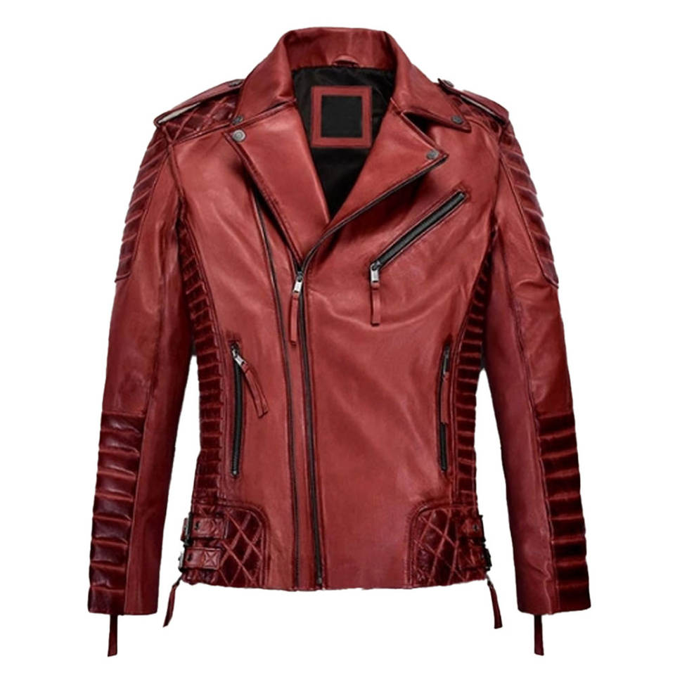 แจ็กเก็ตหนังมีซิปรูดสีแดงสำหรับผู้ชายเทรนด์แฟชั่นแจ็กเก็ตหนังมีพื้นผิวที่น่าสนใจ