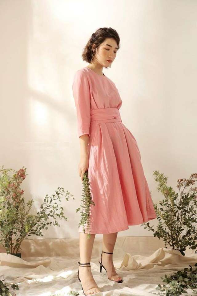 เดรสผ้าลินินสีชมพูแฟชั่นอินเทรนด์ล่าสุดปี 2026 ผ้าฝ้ายเครปแท้ 100% แขน 3/4 สำหรับผู้หญิง