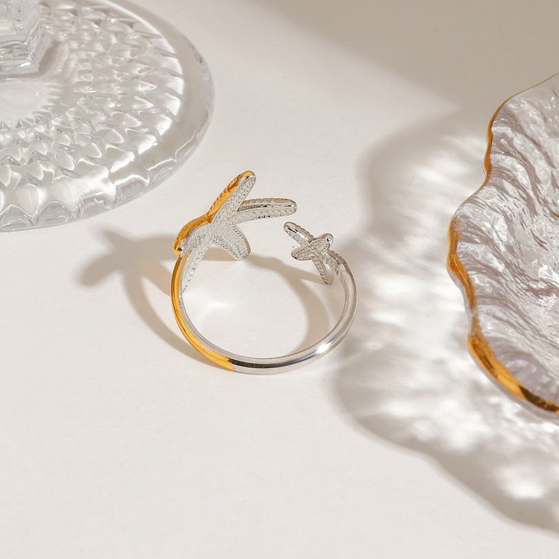 แหวนสแตนเลสสตีลชุบทอง 18K ลายปลาดาว สไตล์วันหยุดสุดเก๋ สีสันตัดกัน ดีไซน์เปิดแบบอสมมาตร