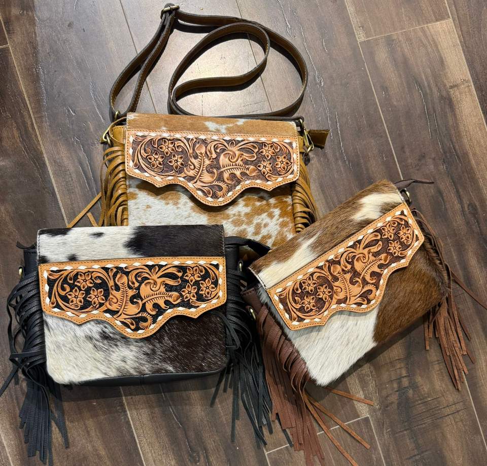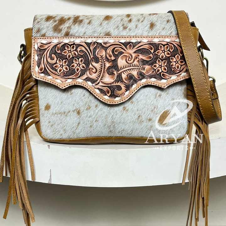 กระเป๋าสะพายข้างหนังแท้สไตล์ตะวันตกสำหรับผู้หญิง ตกแต่งด้วยงานฝีมือ พร้อมสายสะพายไหล่ ใช้งานได้หลากหลาย ทั้งแบบถือและสะพาย