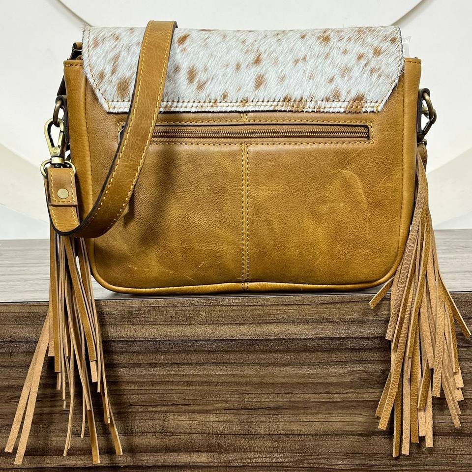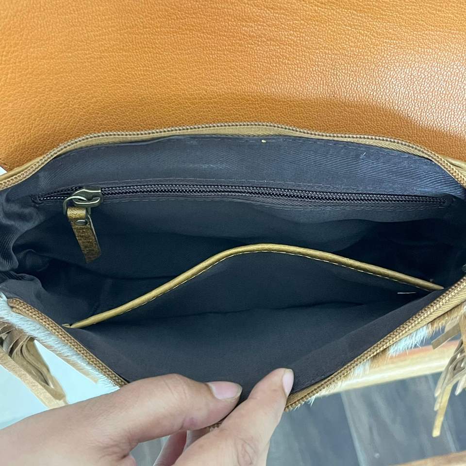 กระเป๋าสะพายข้างหนังวัวประดับพู่