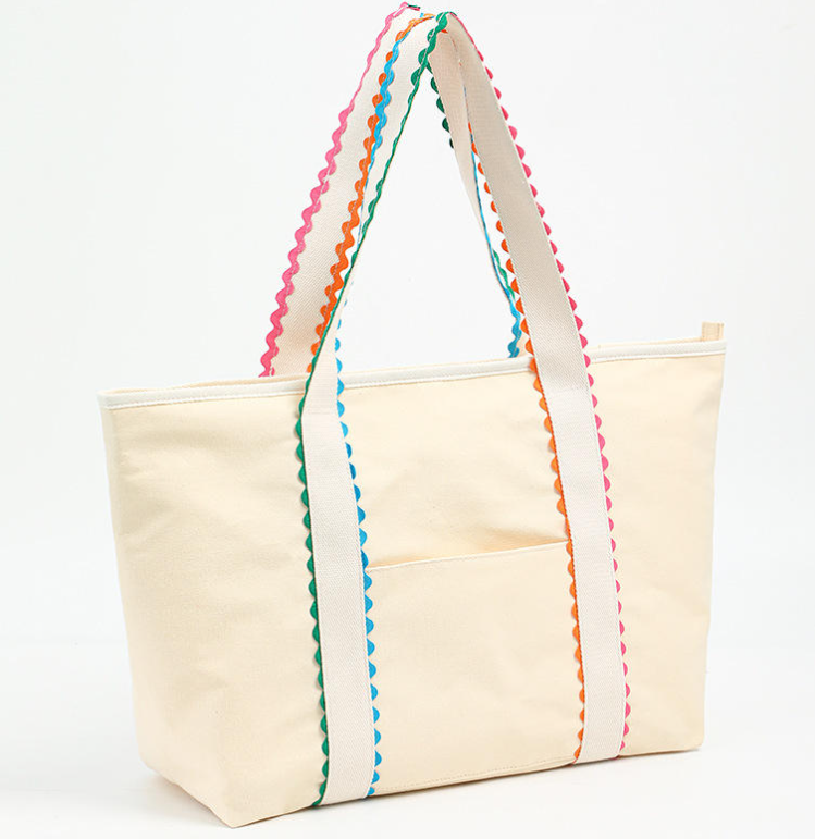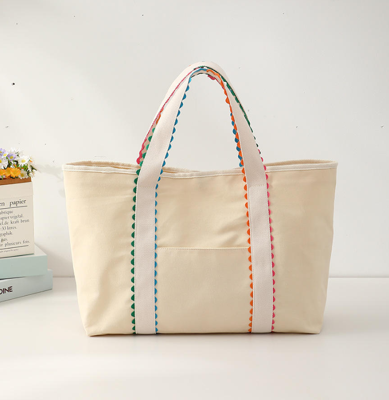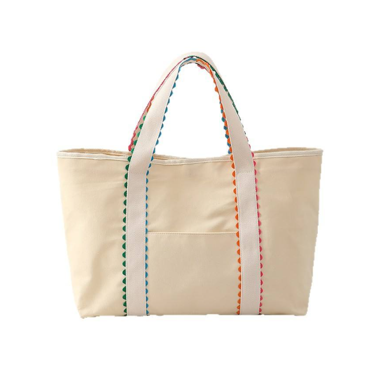 กระเป๋าช้อปปิ้งขนาดใหญ่ทันสมัย กระเป๋าผ้าแคนวาสสีเบจ กระเป๋าสะพายไหล่แบบมีระบาย กระเป๋าโท้ทใบใหญ่ พร้อมโลโก้พิมพ์ตามสั่ง