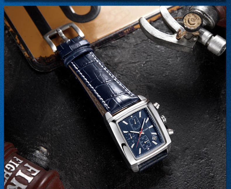Fashionable, retro-style, multi-functional chronograph square genuine leather men's watch, customizable.