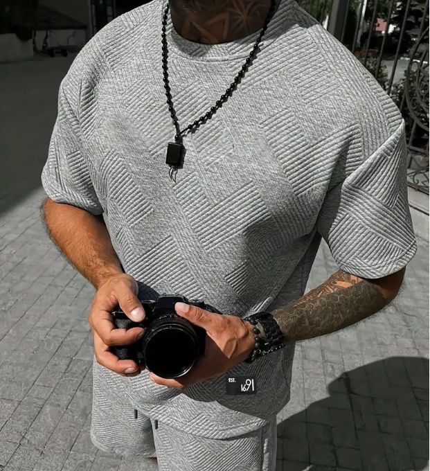 เซ็ตสองชิ้นเสื้อยืดกีฬาของผู้ชายคอกลมสีพื้นโลโก้ตามสั่งแฟชั่น