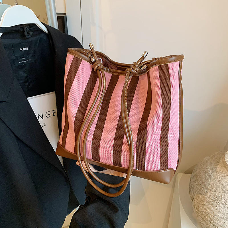 Fashionable women's handbag with pink and brown stripes, canvas and leather combination design