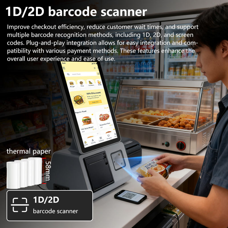 ร้านอาหารฟาสฟู้ดแบบบริการตนเองสำหรับการชำระเงินเทอร์มินัล POS จอสัมผัสแบบต้านทานได้แอนดรอยด์ USB3.0 1080P Wi-Fi 6 NFC เทคโนโลยี