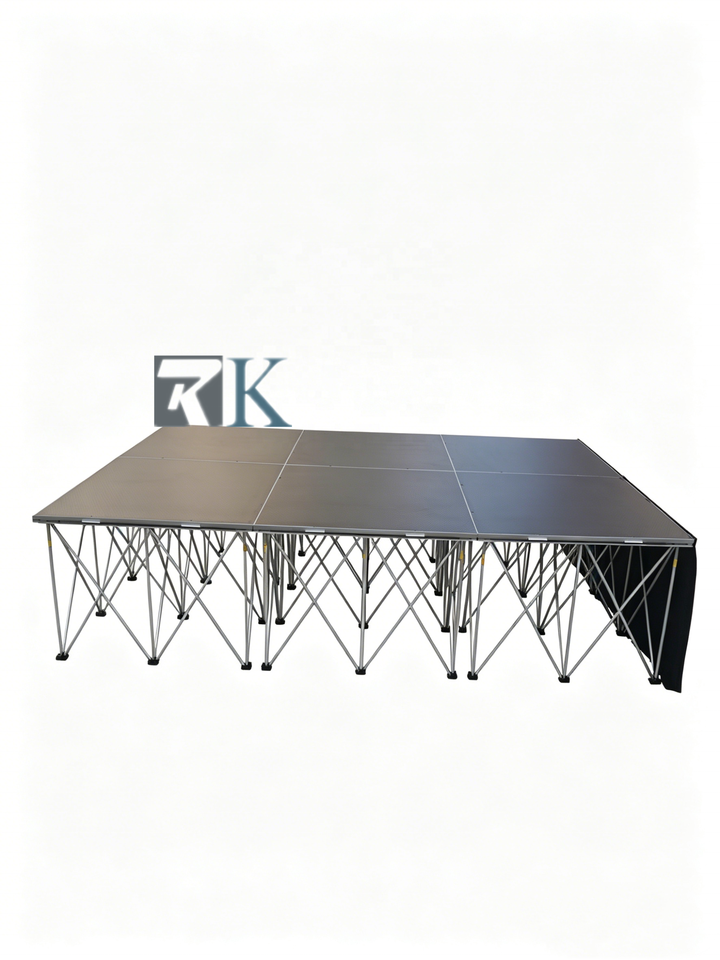 เวทีอลูมิเนียมสมาร์ทสแตจแบบติดตั้งรวดเร็วสำหรับขาย พร้อมพื้นไม้อัดสำหรับคอนเสิร์ต เวทีพับได้แบบพกพาสำหรับงานแต่งงาน คอนเสิร์ต และงานดนตรี