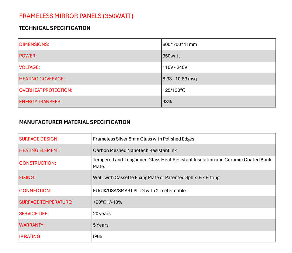 กระจกอินฟราเรดไร้กรอบ 350 วัตต์ ขายดี พร้อมไฟ LED สีขาวอุ่น/เย็น ป้องกันความร้อนเกินมาตรฐาน IP65 ควบคุมผ่านแอป